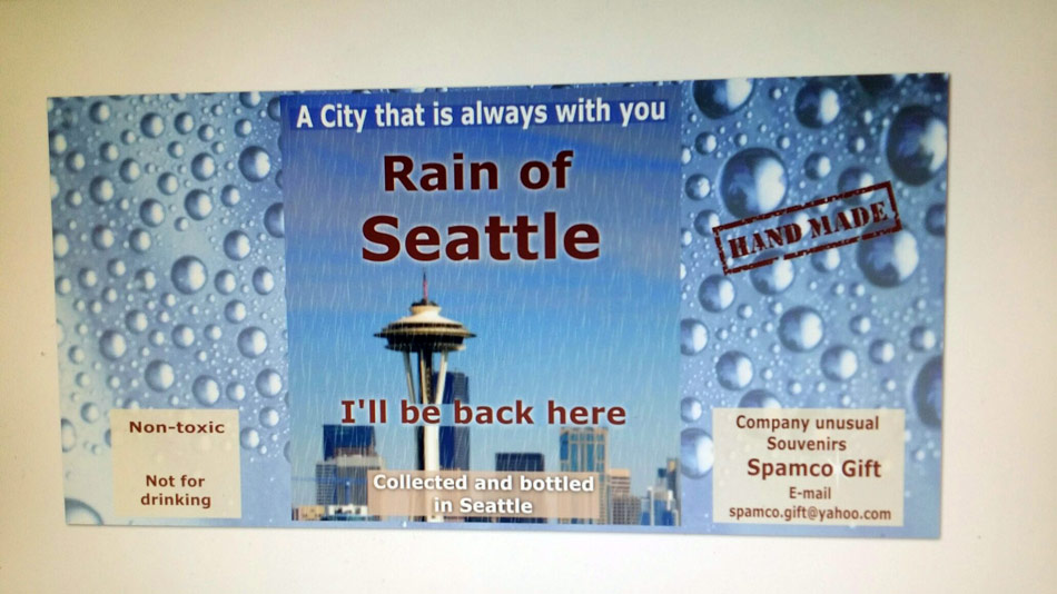 До нас у студію звернувся Замовник із цього міста для створення нової етикетки (редизайну існуючої) для сувеніру – баночка зі справжньою дощовою водою: Original Seattle's rain. Вода збирається вручну і пакується в спеціальні пляшечки. Для роботи Замовником була надана оригінальна авторська фотографія міста, де можна побачити одну з визначних пам'яток міста – вежу Space Needle. Вона була збудована до виставки Seattle Center, яка проходила у 1962 році. На величезній площі Центру розташовані планетарій, науковий центр, ресторани, парки розваг, магазини, проводяться різноманітні концерти та фестивалі. Space Needle повинна була вразити уяву відвідувачів своїми розмірами, а так само надавала можливість пообідати на висоті півтори сотні метрів над землею – у верхній частині гігантської голки розташовувався ресторан SkyCity, що обертається.