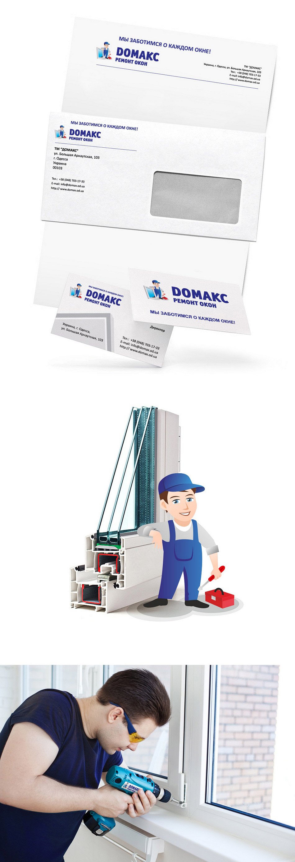 Нам потрібно було створити компанію, яка б займалася ремонтом вікон у м.Одеса. За місяць студією було виконано та погоджено з нами дуже велику роботу від розробки назви та слогана – до фірмового стилю та персонажа компанії.