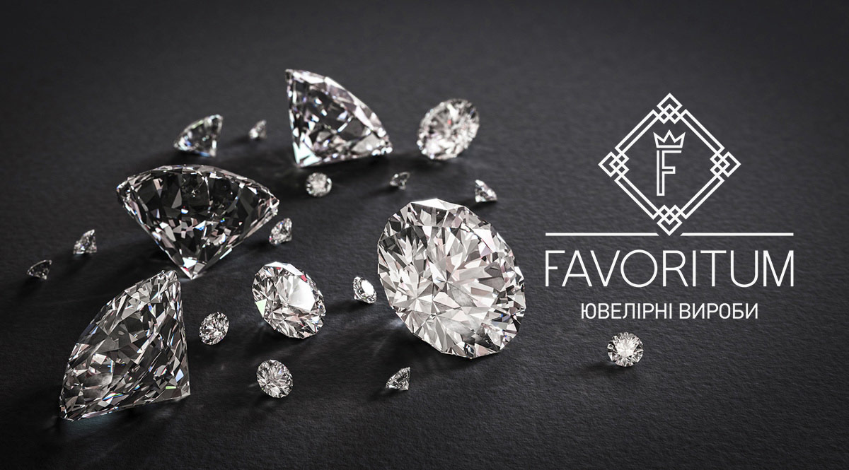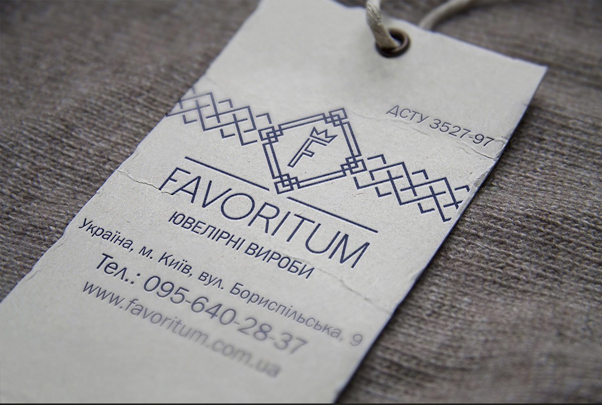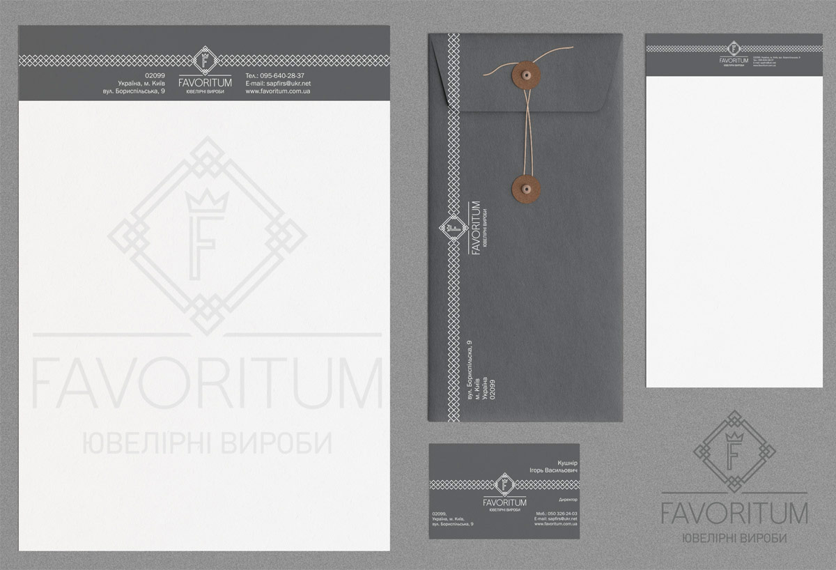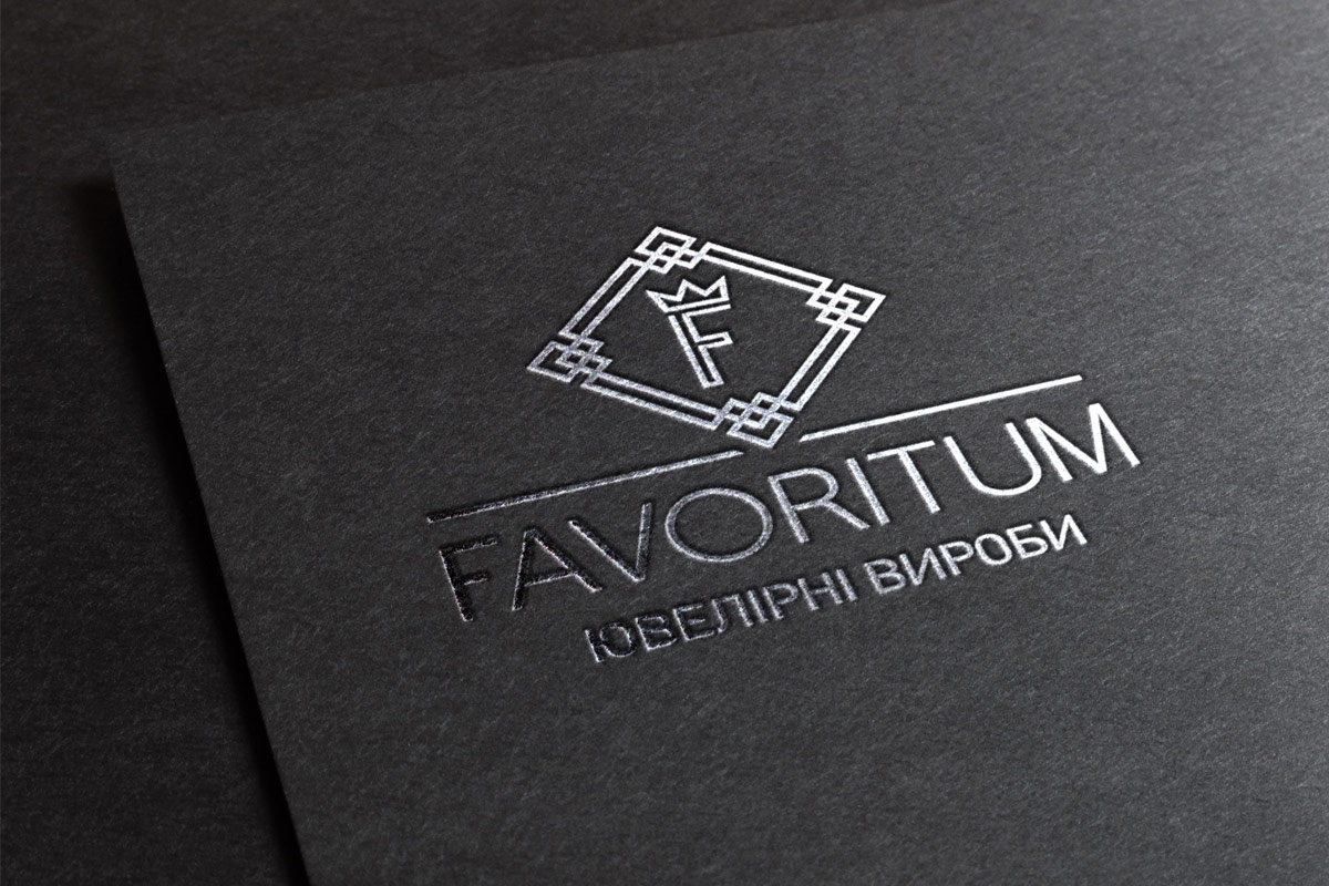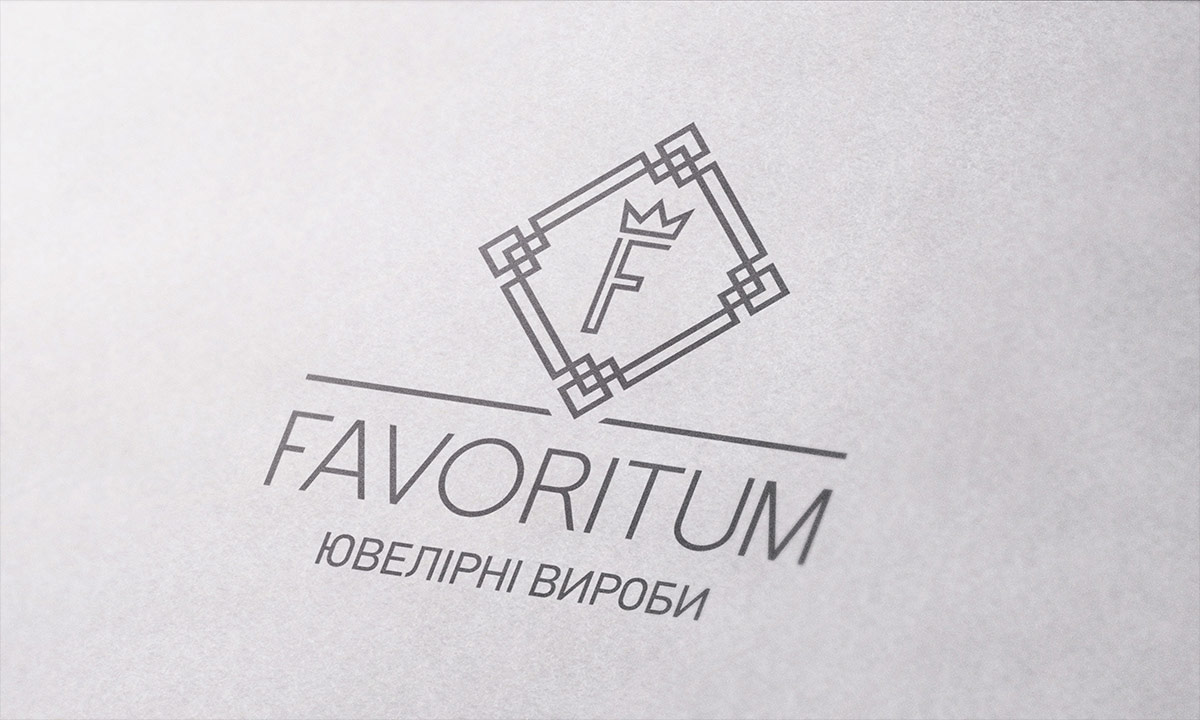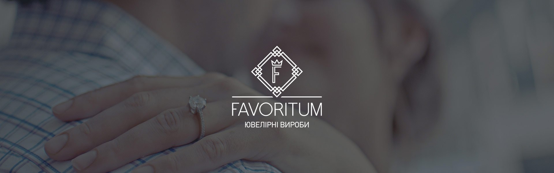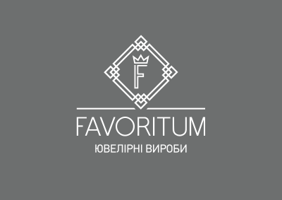 Логотип «FAVORITUM» з дескриптором «ЮВЕЛІРНІ ВИРОБИ» пов'язаний у класичний вертикальний фірмовий блок, що відображає шану консервативним традиціям ювелірної справи – точність, міцність та симетрія.