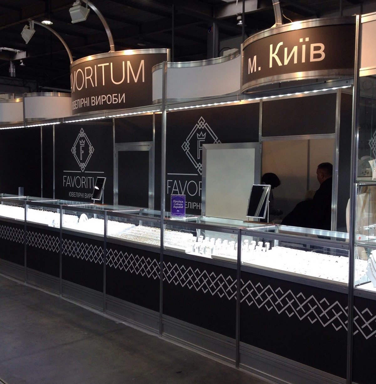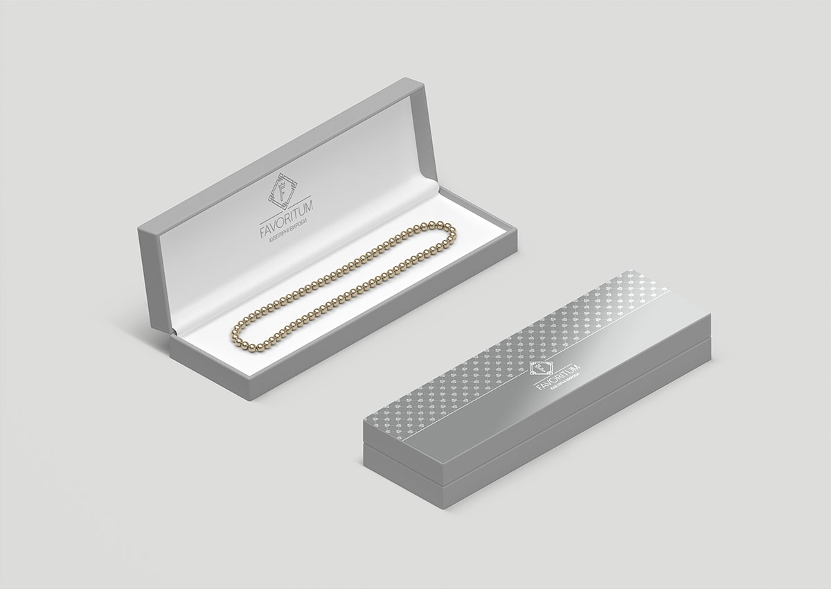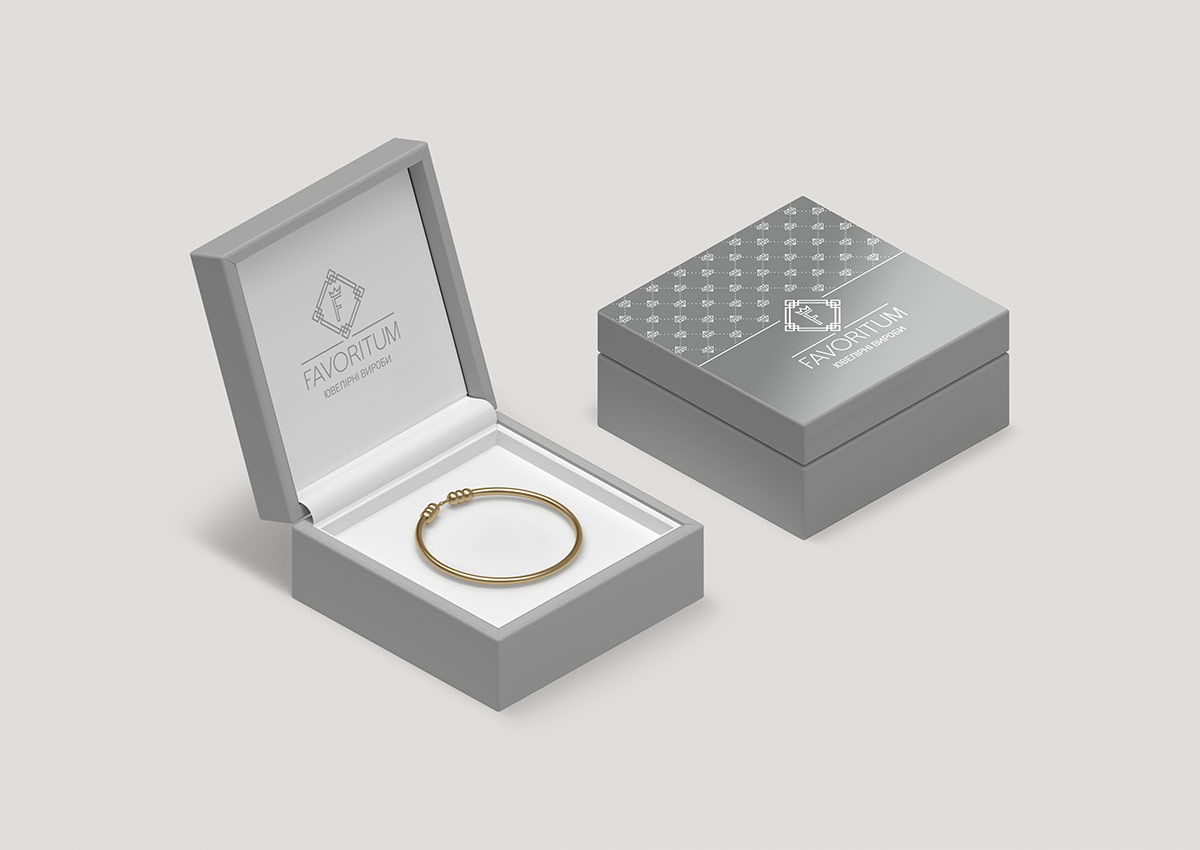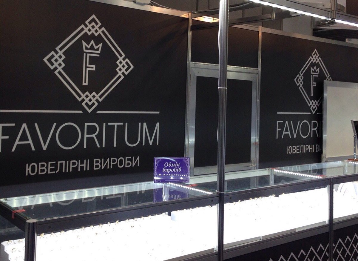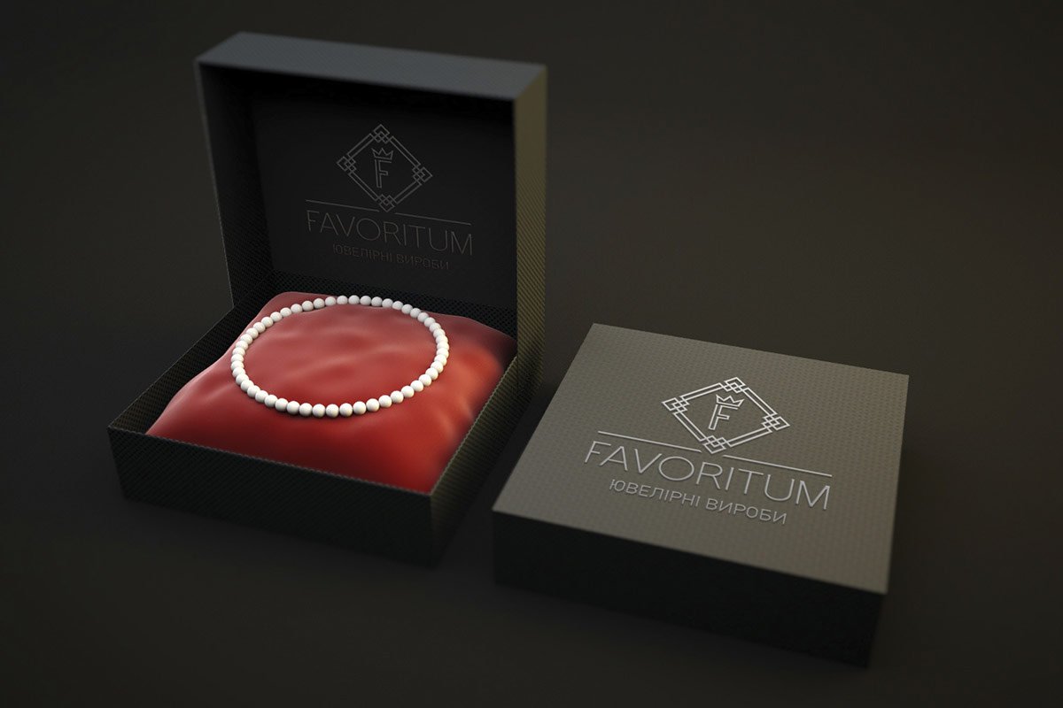 Логотип «FAVORITUM» з дескриптором «ЮВЕЛІРНІ ВИРОБИ» пов'язаний у класичний вертикальний фірмовий блок, що відображає шану консервативним традиціям ювелірної справи – точність, міцність та симетрія.