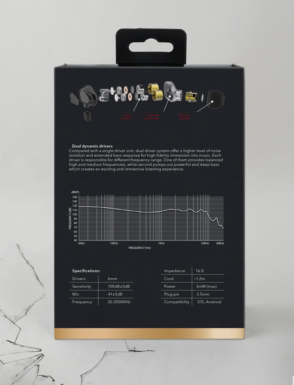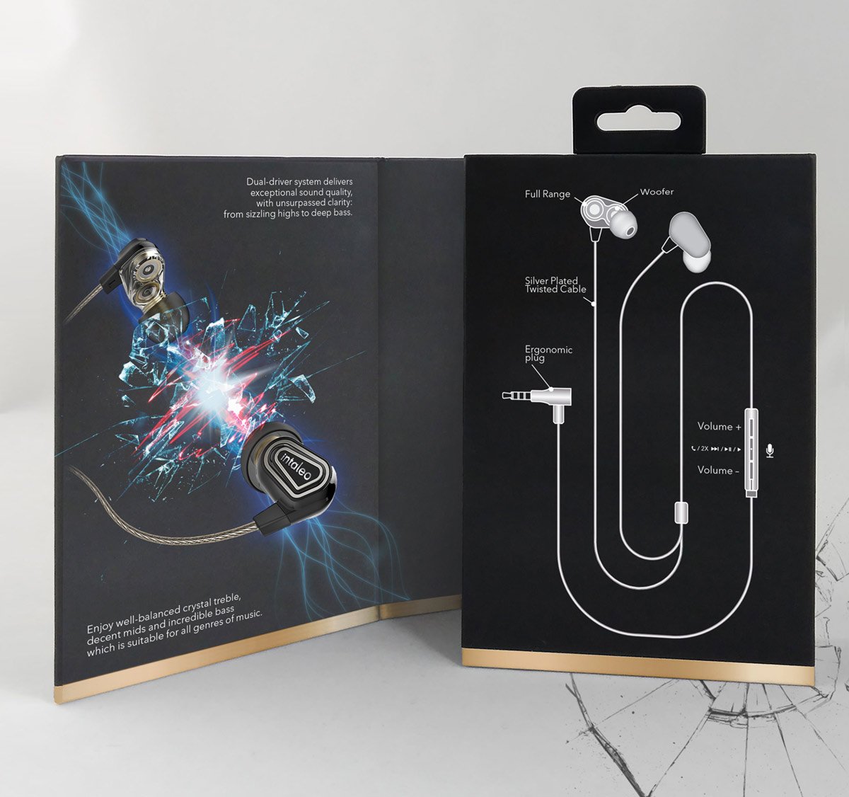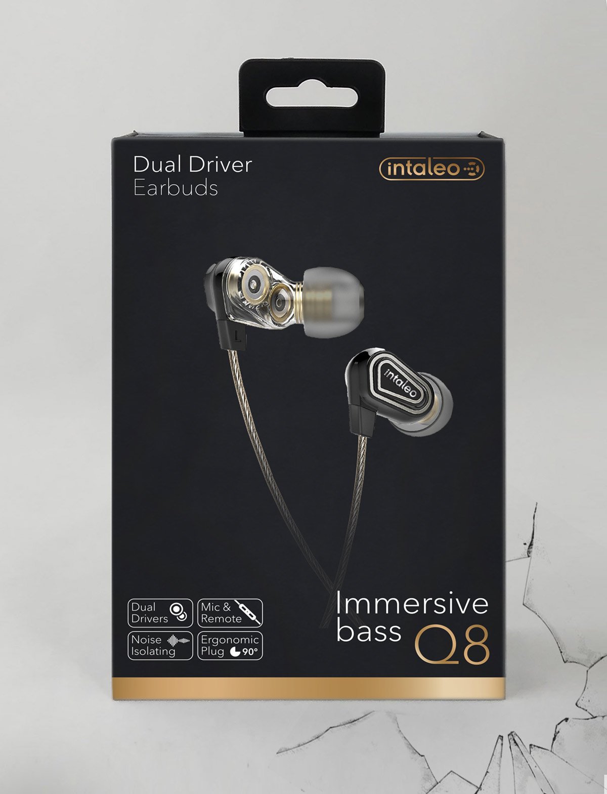 Розробка дизайну упаковки навушників Dual Driver Earbuds, модель - Immersive bass Q8 (Made in Hong Kong). Дизайн розробленої упаковки навушників підкреслює їх особливості (наведені нижче). Бренд INTALEO, створений нашою студією, є яскравим прикладом креативності, яка проявляється у дизайні його упаковки. Цікава, солідна, інноваційна та помітна упаковка завжди виділяється серед конкурентів та привертає увагу споживача завдяки продуманому та функціональному дизайну.