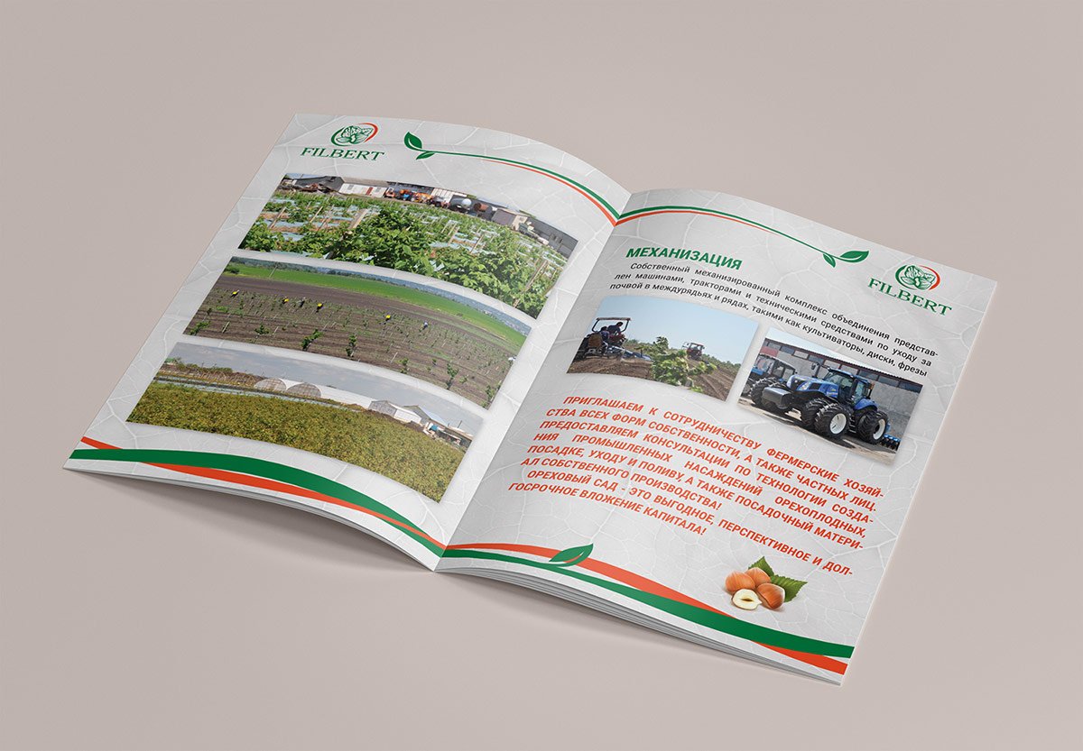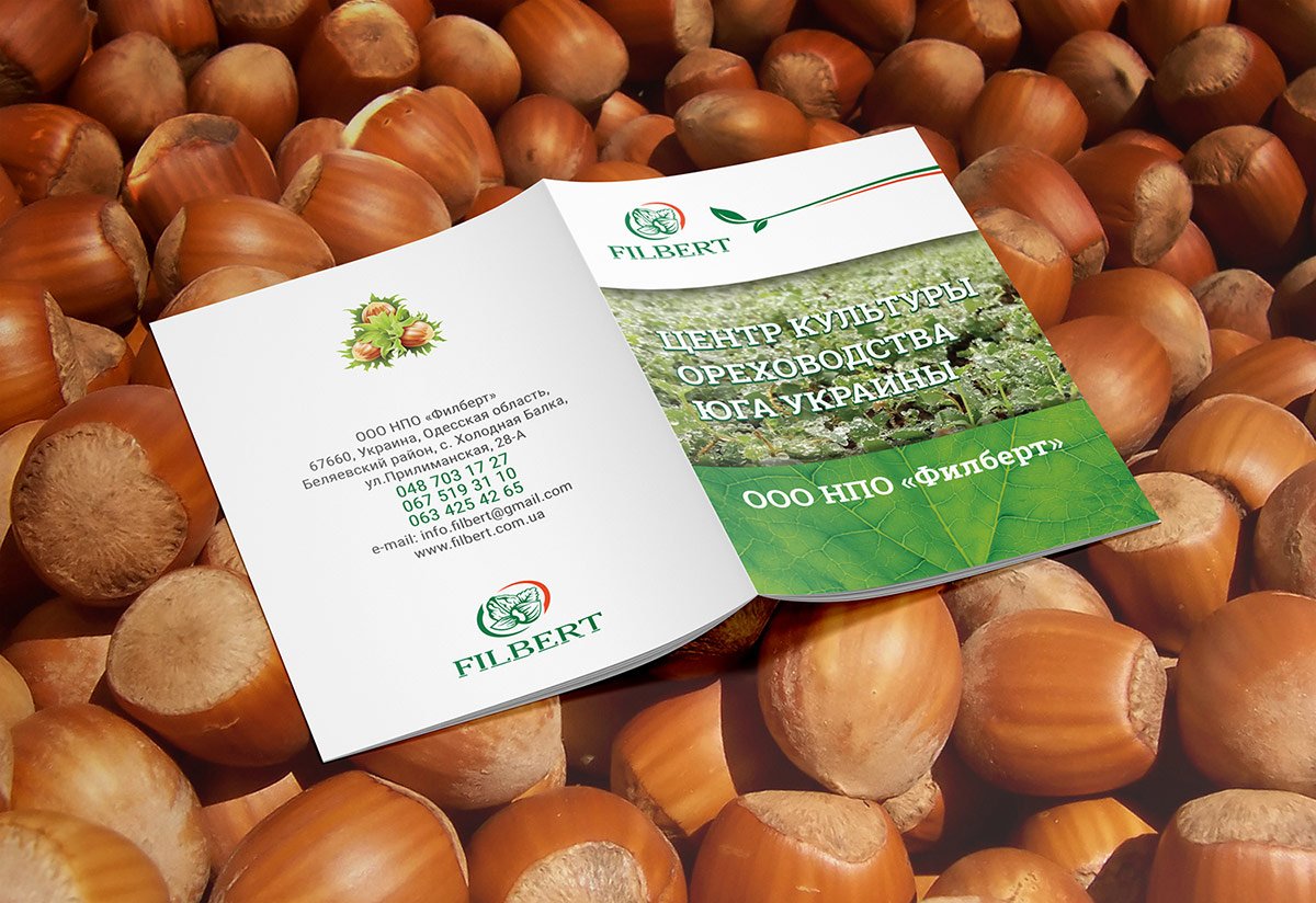 Розробка дизайну та верстка буклету для ТОВ НВО «Філберт» (Україна) - високотехнологічне сільськогосподарське виробництво, що використовує технології інтенсивного землеробства, краплинного поливу, датчики вологи в ґрунті, інтелектуальне підживлення рослин за принципом "необхідне вчасно", віддалений контроль за поливом та виробництвом. Основні культури, що культивуються - горіхові, а саме: фундук, мигдаль, волоський горіх.