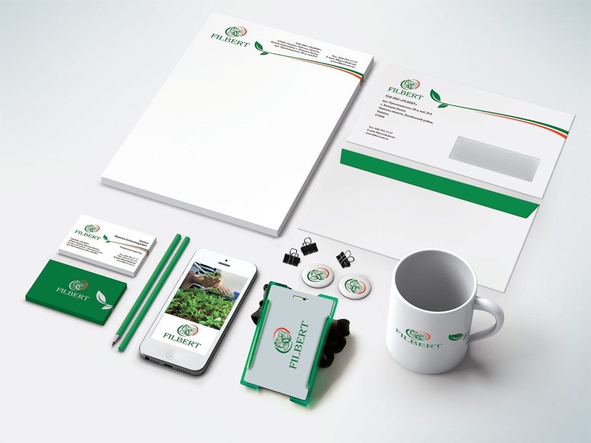 Особливу увагу хочеться приділити фірмовому стилю, який відображає динаміку розвитку компанії. В рамках замовлення розроблено стандартний набір документів: візитні картки, конверт, фірмовий бланк. Розроблений фірмовий стиль з елементами листочків рослин, актуальний завжди та доречний практично скрізь. Основною відмінністю стилю є строгість, запам'ятовуваність і елегантність.