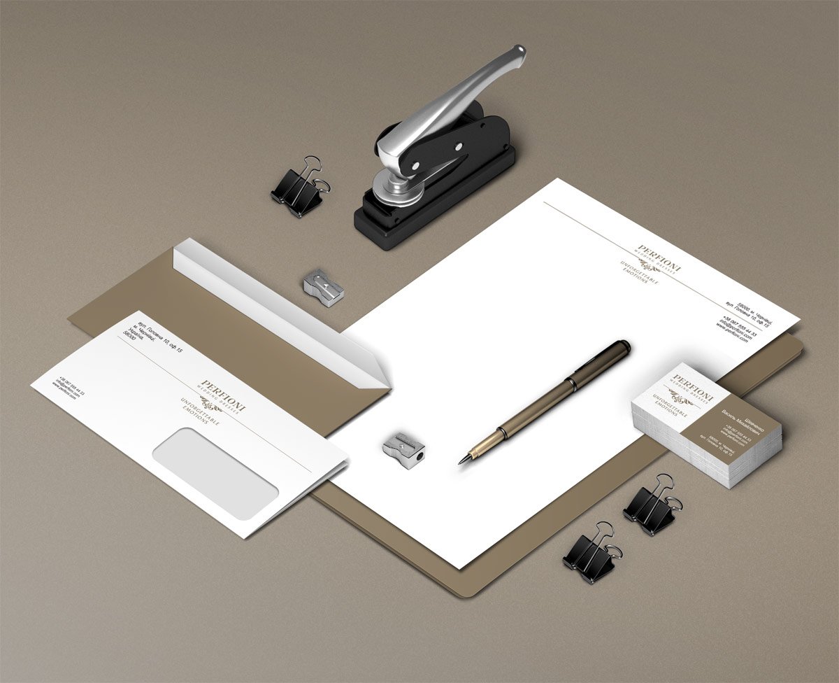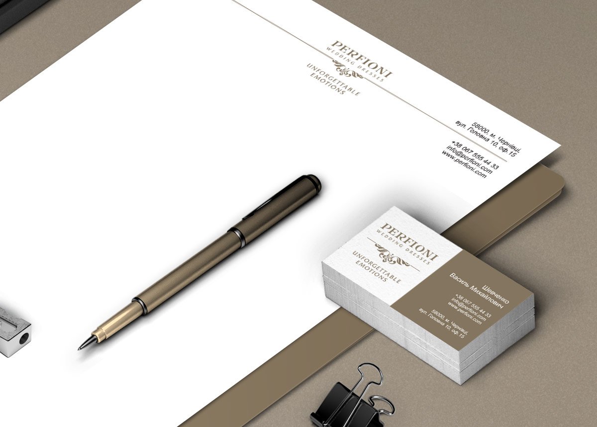 Особливу увагу хочеться приділити фірмовому стилю, який відображає красу та витонченість бренду. В рамках замовлення розроблено стандартний набір документів: візитні картки, конверт, фірмовий бланк. Розроблений фірмовий стиль виконаний у строгому стилі із застосуванням витончених декоративних елементів. Основною відмінністю розробленого стилю є запам'ятовуваність і елегантність.