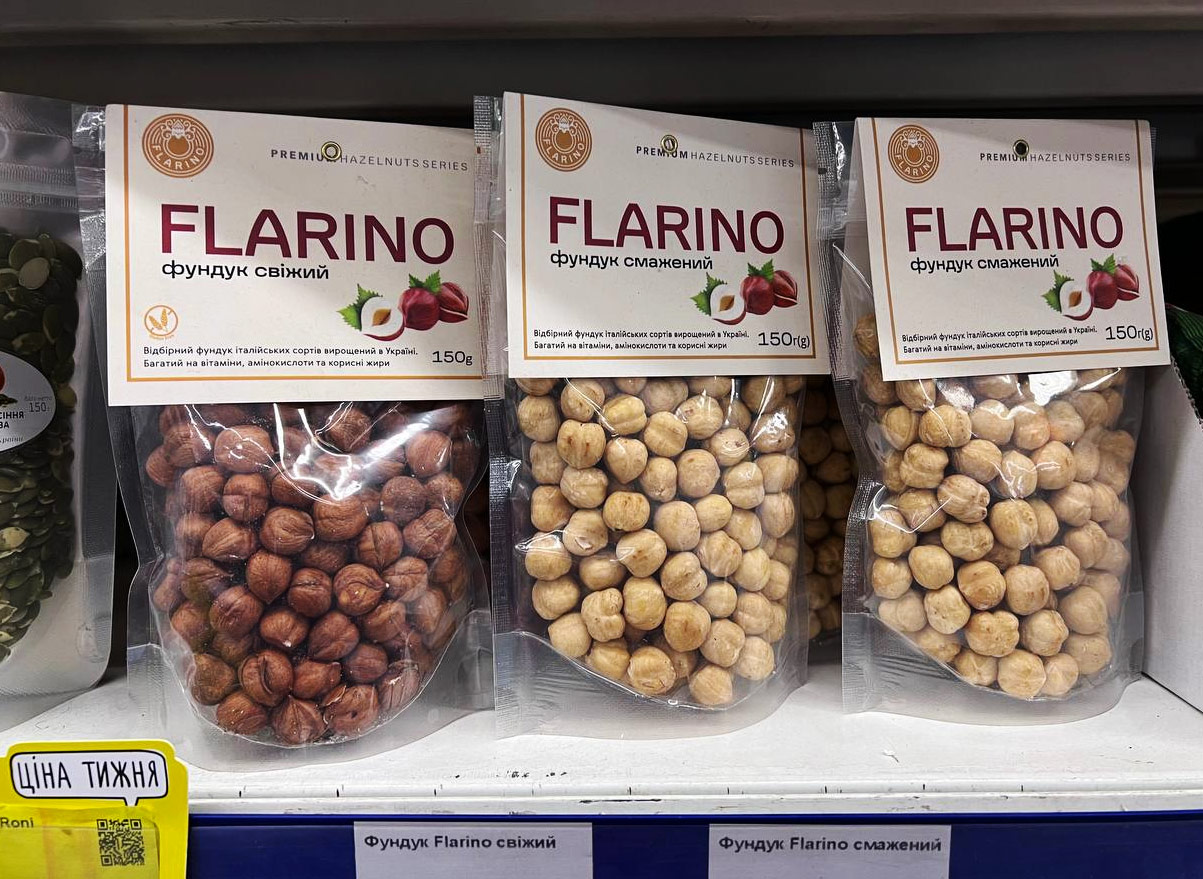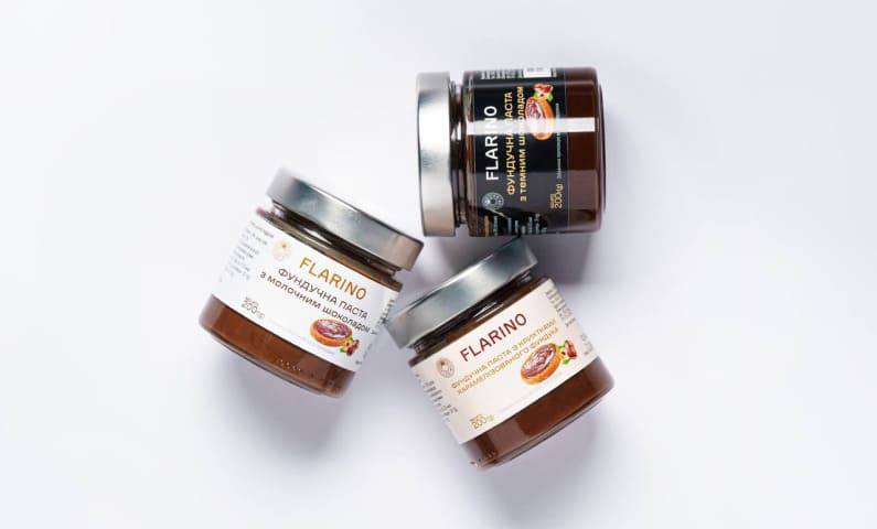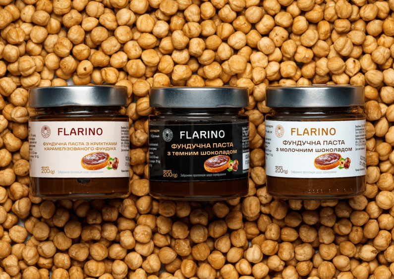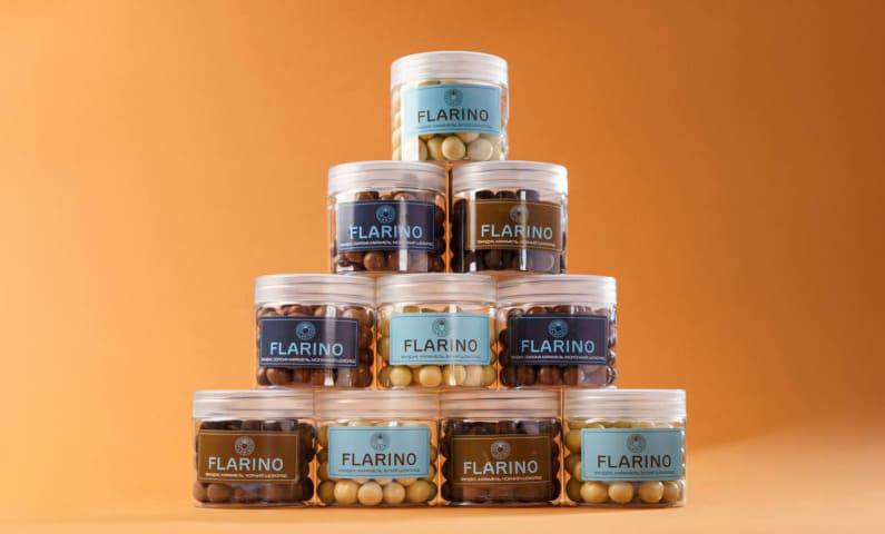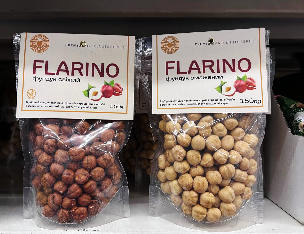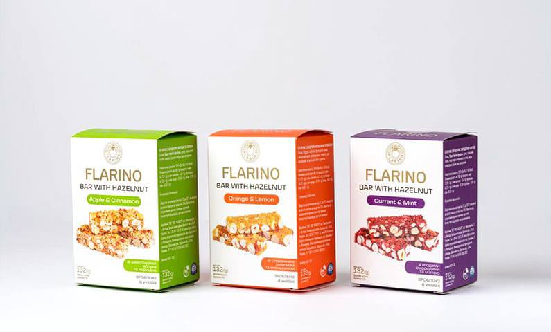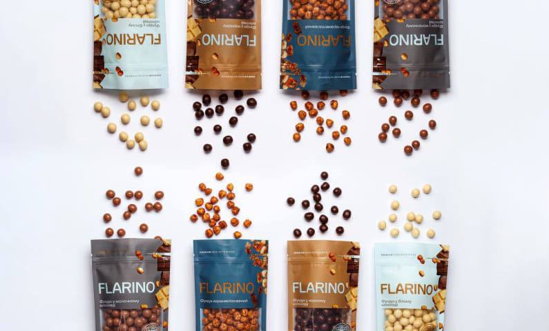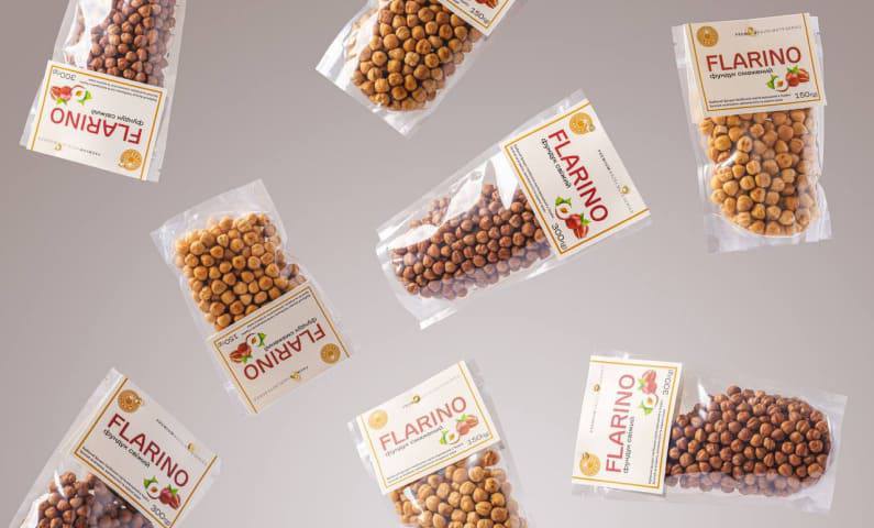 Розроблений логотип виконаний у вигляді круглої емблеми, всередині якої знаходяться графічні елементи, горіх та назва “FLARINO”, шрифтове написання якого розроблено дизайнерами нашої студії та адаптовано під загальний стиль бренду.
