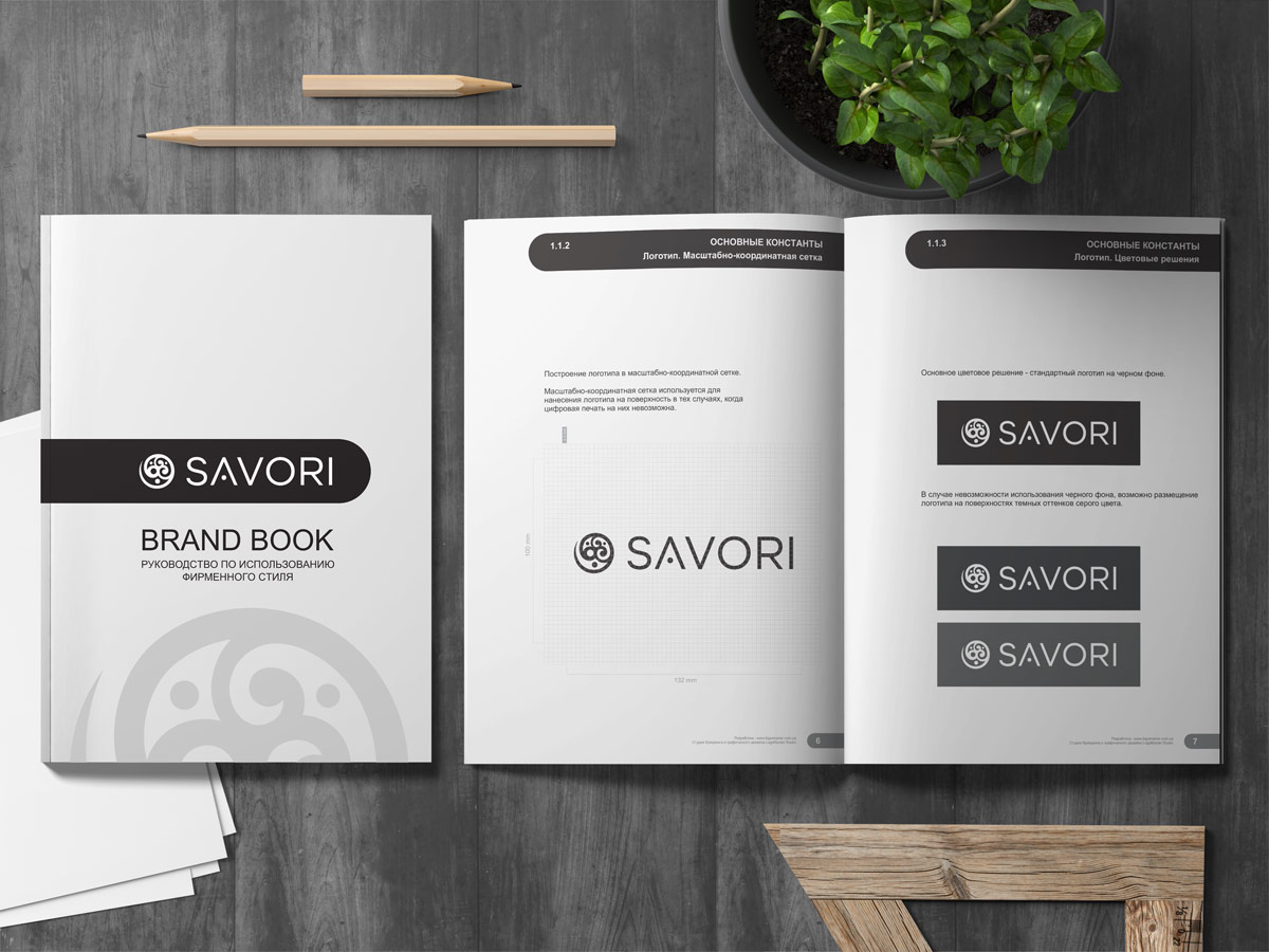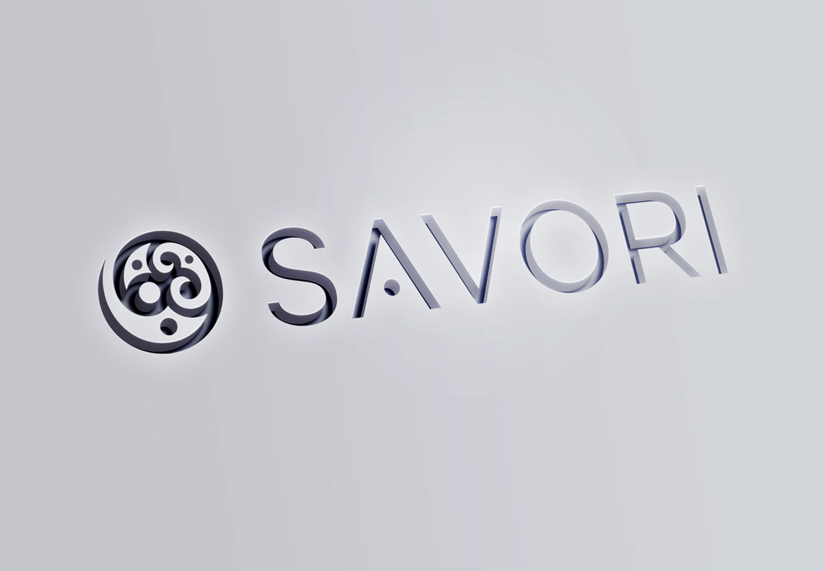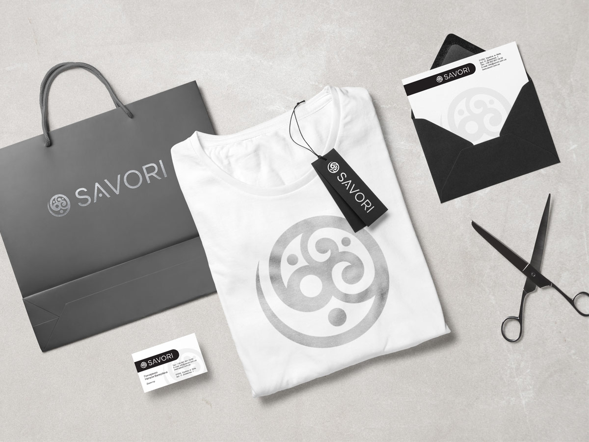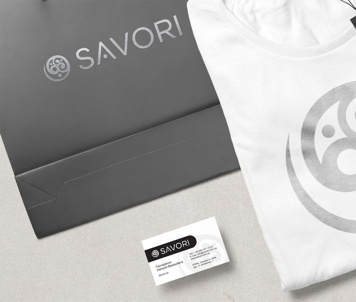Чорний колір логотипу відображає строгість і чудово поєднується з усіма іншими кольорами. Шрифтове написання назви “SAVORI” у логотипі розроблено дизайнерами нашої студії та адаптовано під загальний стиль бренду.