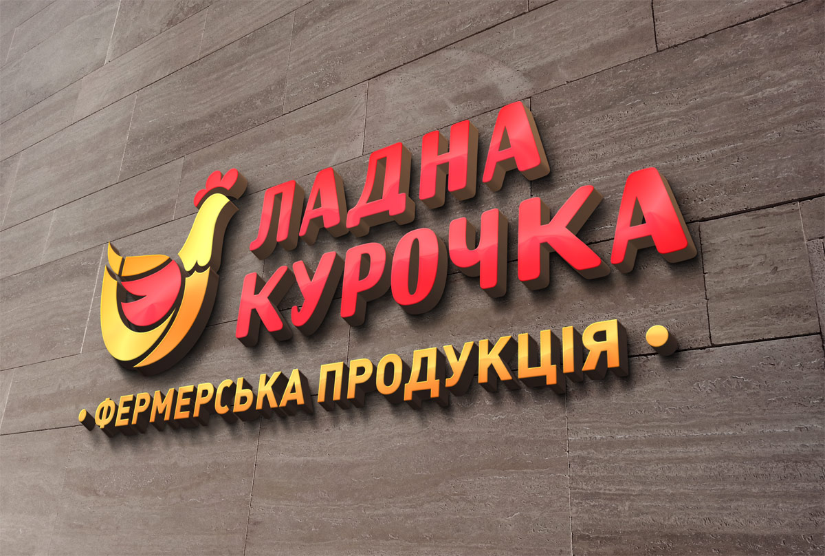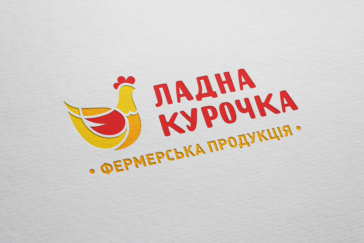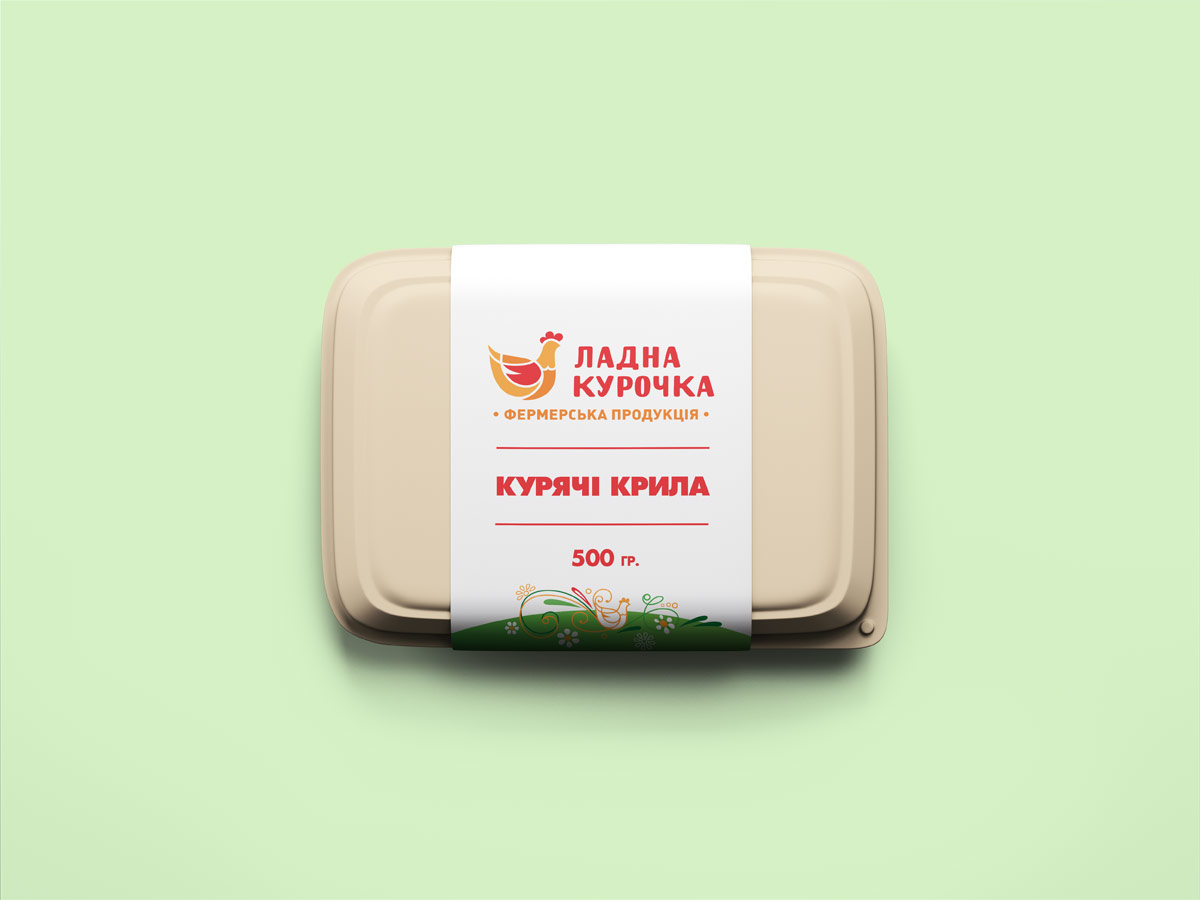 Шрифтове написання назви “ЛАДНА КУРОЧКА” у логотипі розроблено дизайнерами нашої студії та адаптовано під загальний стиль бренду. Для розшифровки діяльності було прийнято використовувати у логотипі дескриптор ФЕРМЕРСЬКА ПРОДУКЦІЯ.