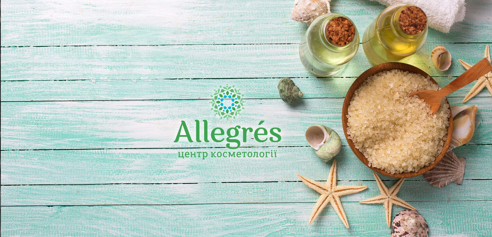 Шрифтове написання назви “Allegrés” у логотипі розроблено дизайнерами нашої студії та адаптовано під загальний стиль бренду. Для розшифровки діяльності було заведено використовувати в логотипі дескриптор “центр косметології”.