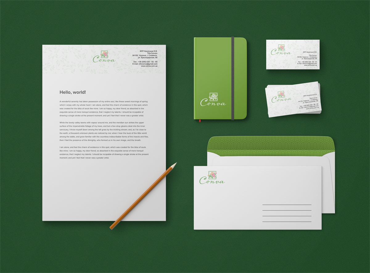 Особливу увагу хочеться приділити фірмовому стилю, який відображає красу та стиль бренду. В рамках замовлення розроблено стандартний набір документів: візитні картки, конверт, фірмовий бланк. Фірмовий стиль у вигляді патерну з квітів доповнює логотип та підкреслює елегантність бренду.