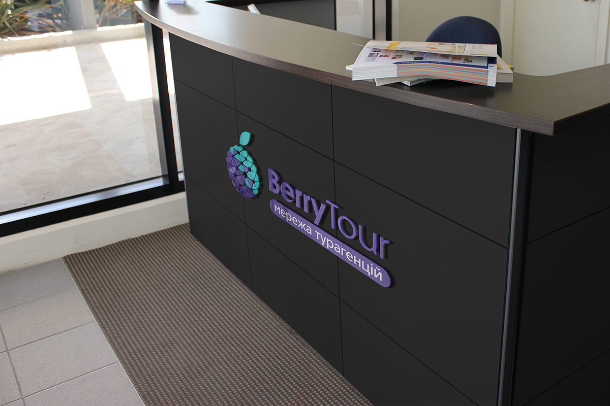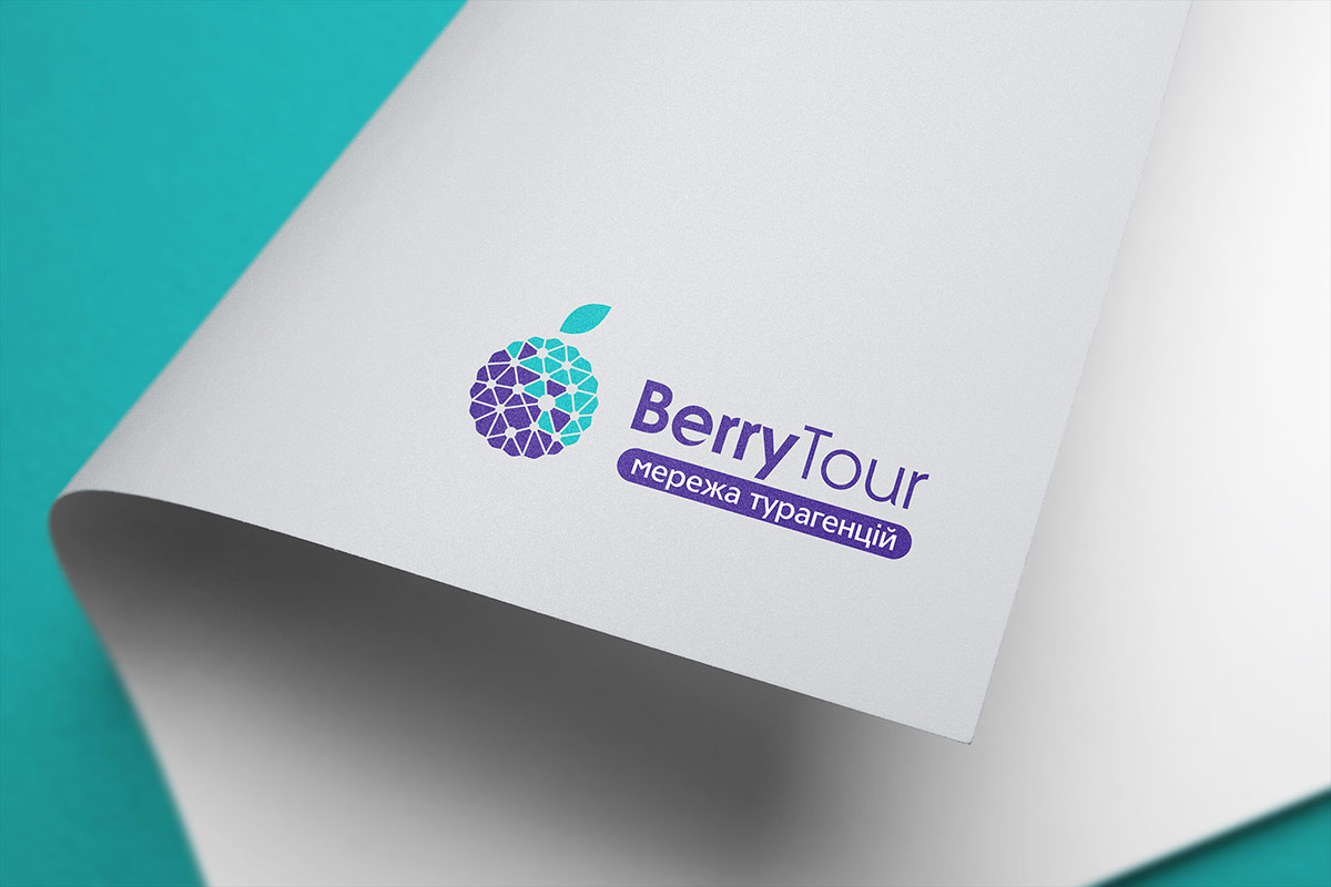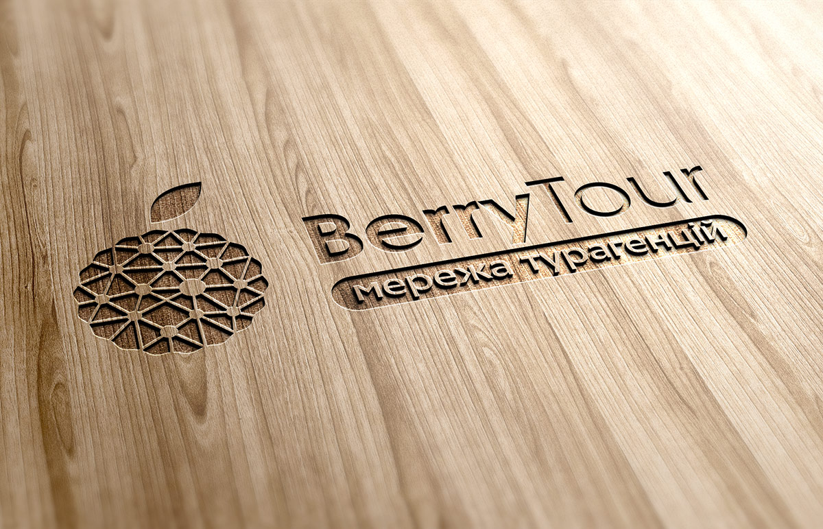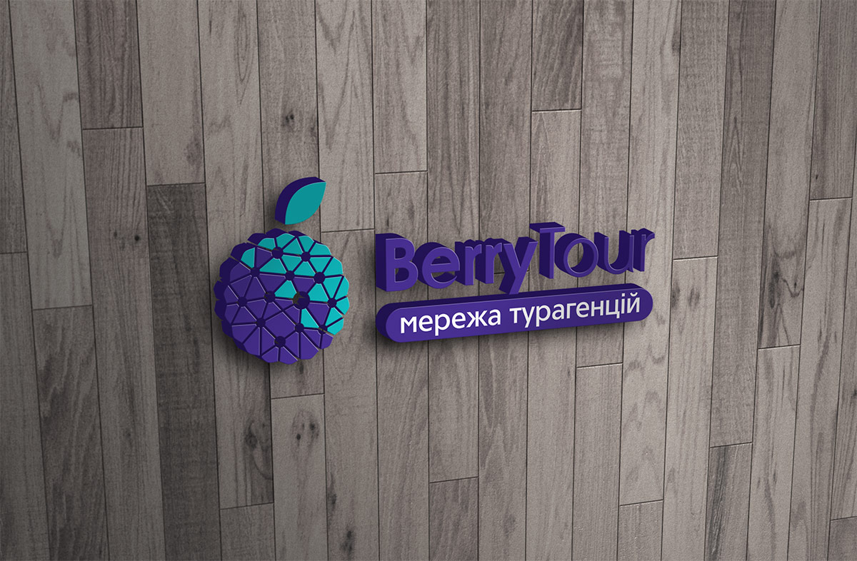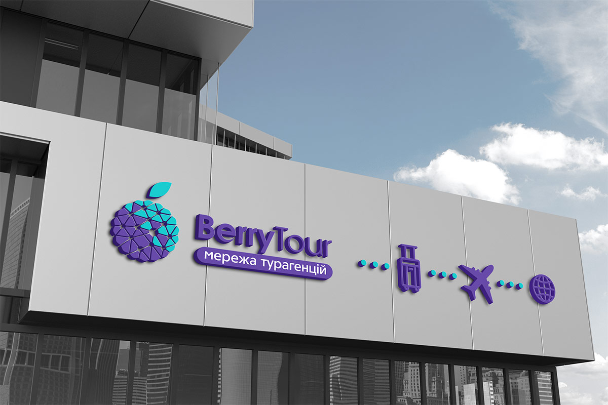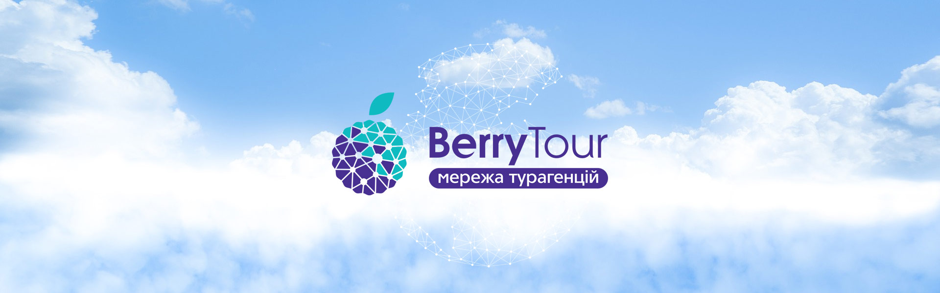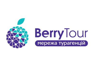 Шрифтове написання назви “BerryTour” у логотипі розроблено дизайнерами нашої студії та адаптовано під загальний стиль бренду. Для розшифровки діяльності було прийнято використовувати у логотипі дескриптор “мережа турагенцій”.