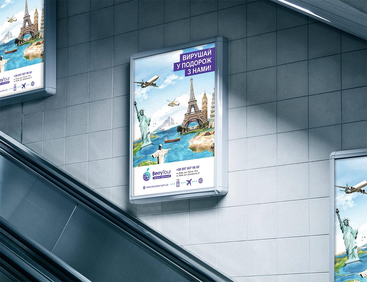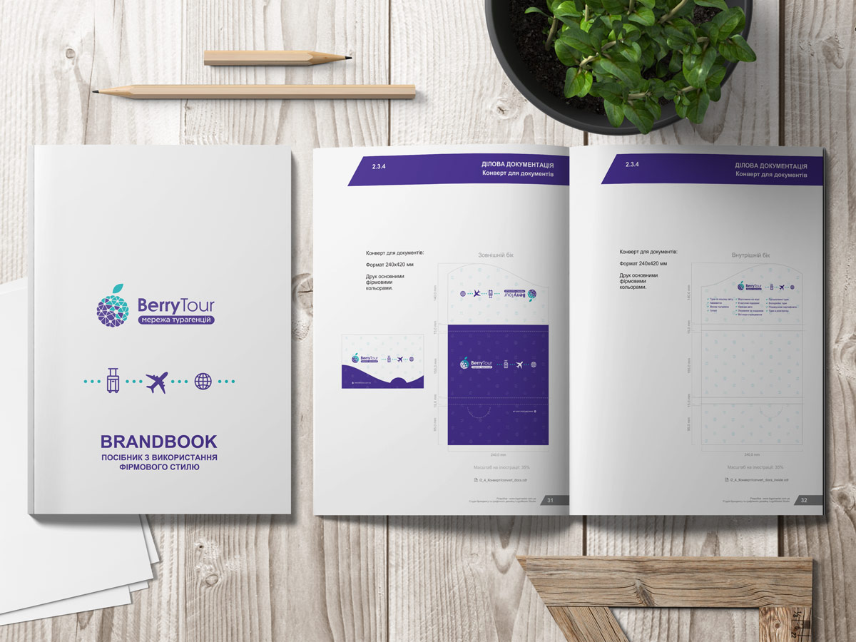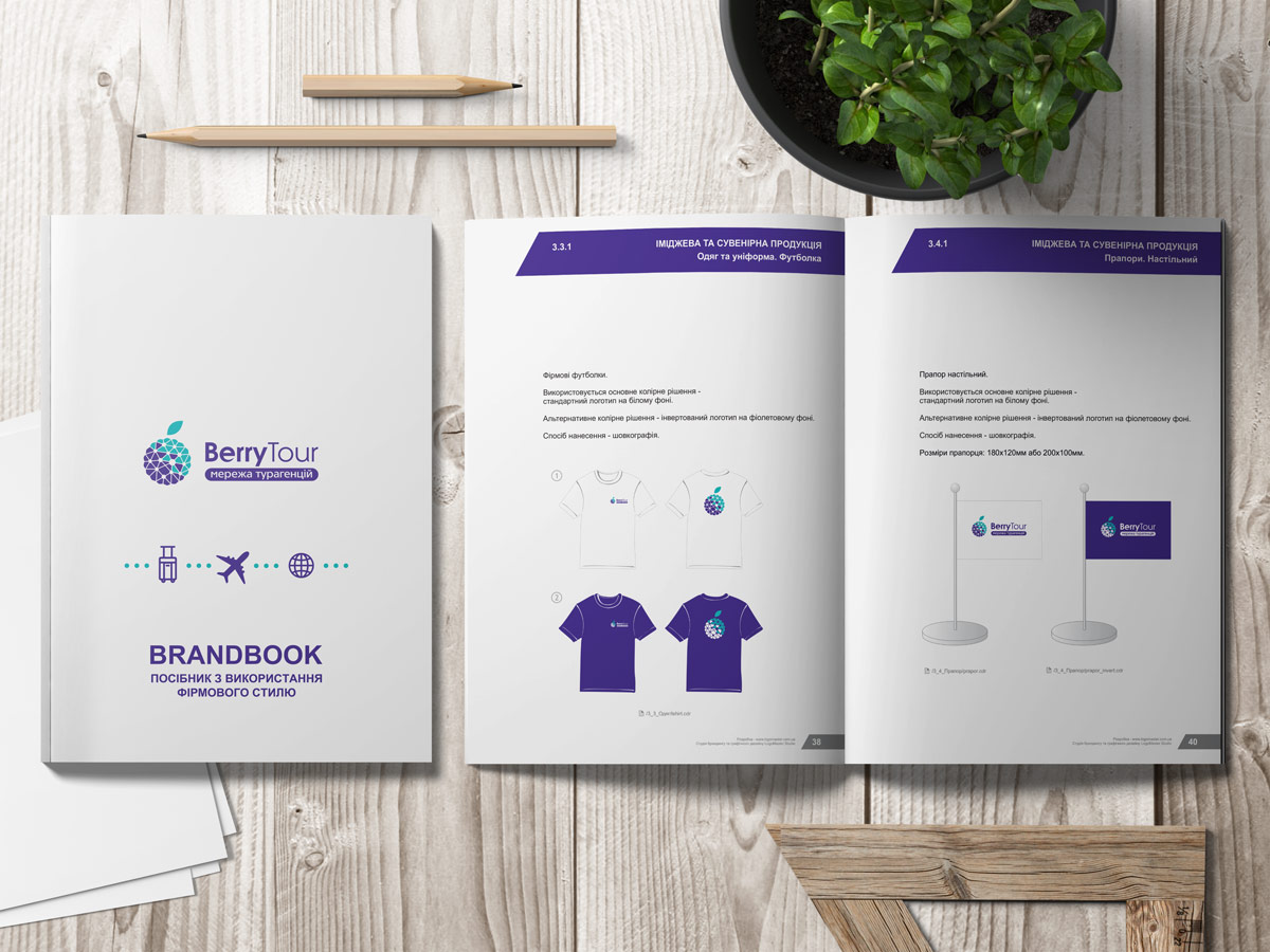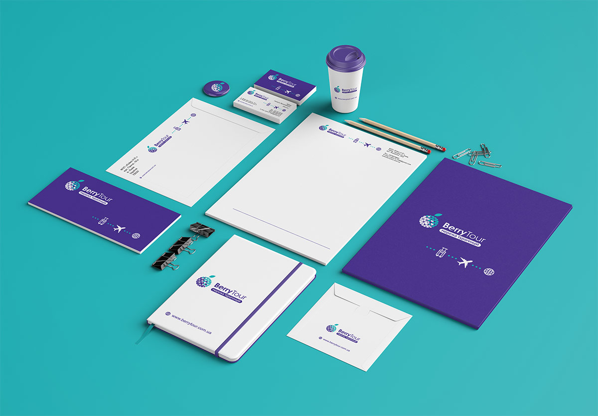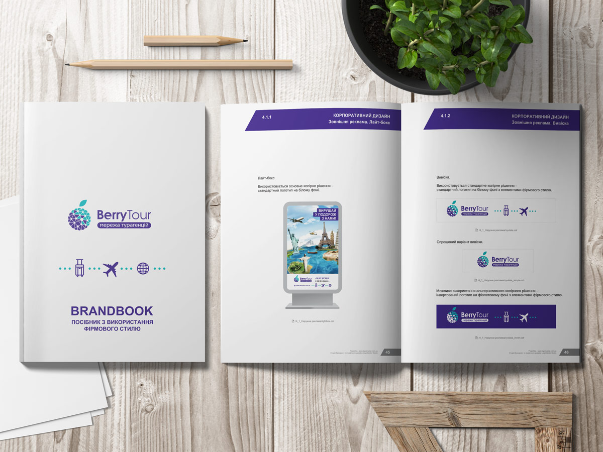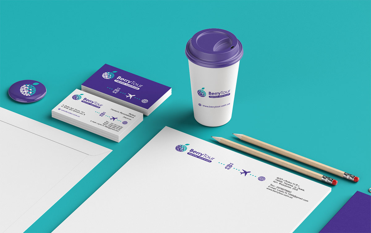 Шрифтове написання назви “BerryTour” у логотипі розроблено дизайнерами нашої студії та адаптовано під загальний стиль бренду. Для розшифровки діяльності було прийнято використовувати у логотипі дескриптор “мережа турагенцій”.