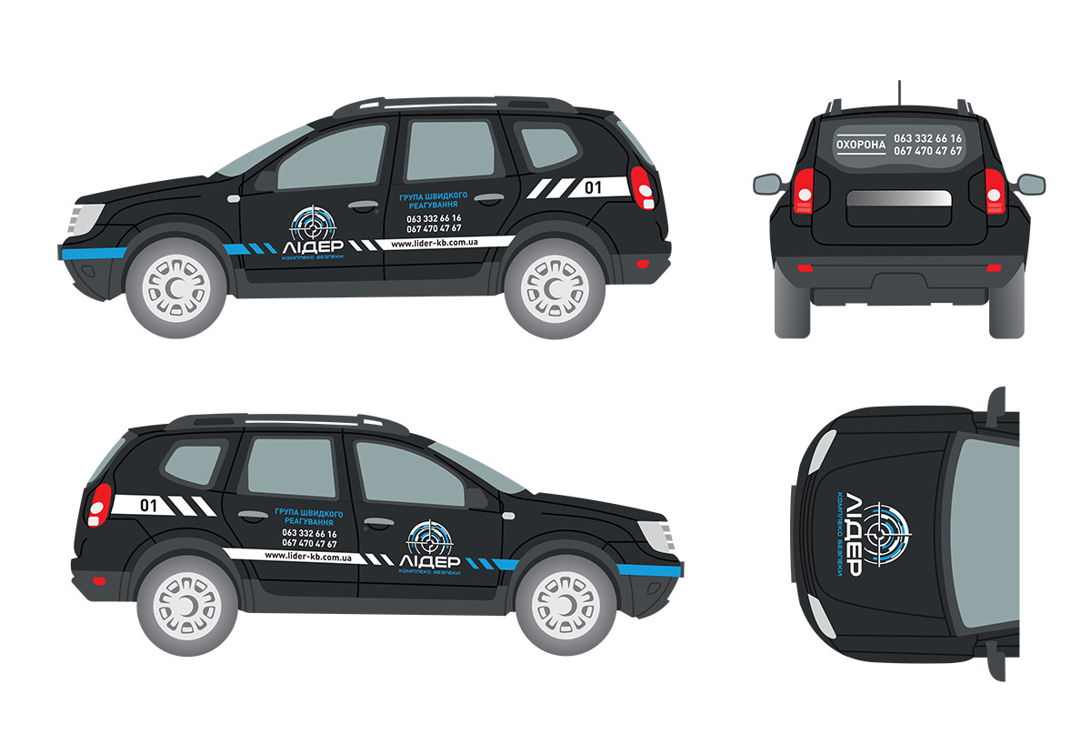 Брендування автомобіля охоронної компанії – це ефективна реклама, яка привертає увагу багатьох людей. Таким способом Ви зможете донести свою рекламу до більшості потенційних клієнтів. Наша студія дизайну займається створенням цього виду зовнішньої реклами - розробкою дизайн-макета оформлення автомобіля.