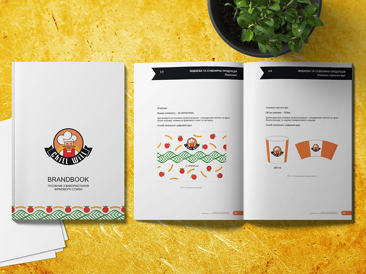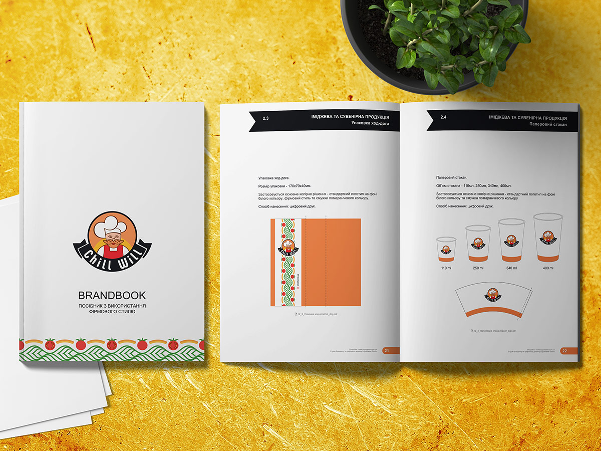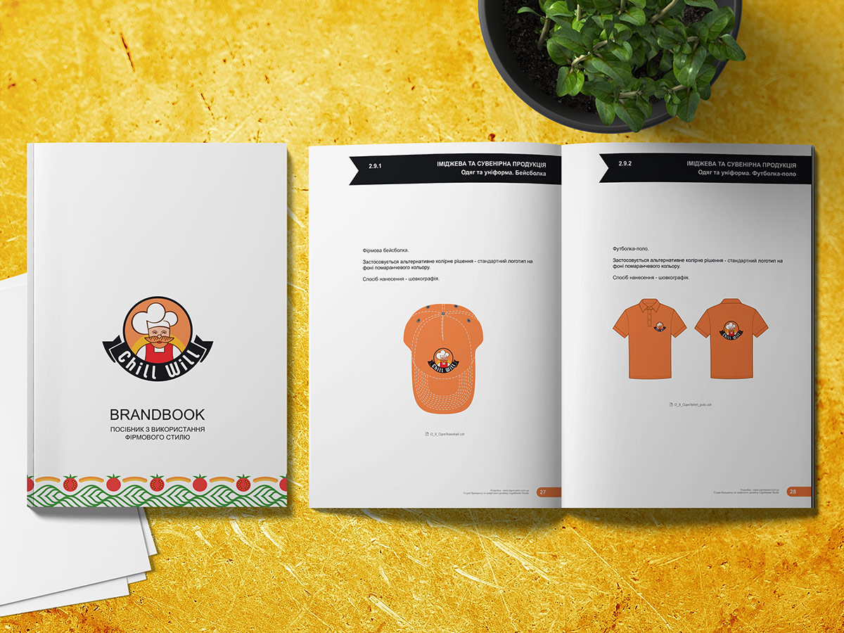 Після детального обговорення різних варіантів Замовник затвердив наведений нижче логотип з персонажем – добрим кухарем. Шрифтове написання назви “ChillWill” розроблено дизайнерами нашої студії та виконане у строгому стилі.