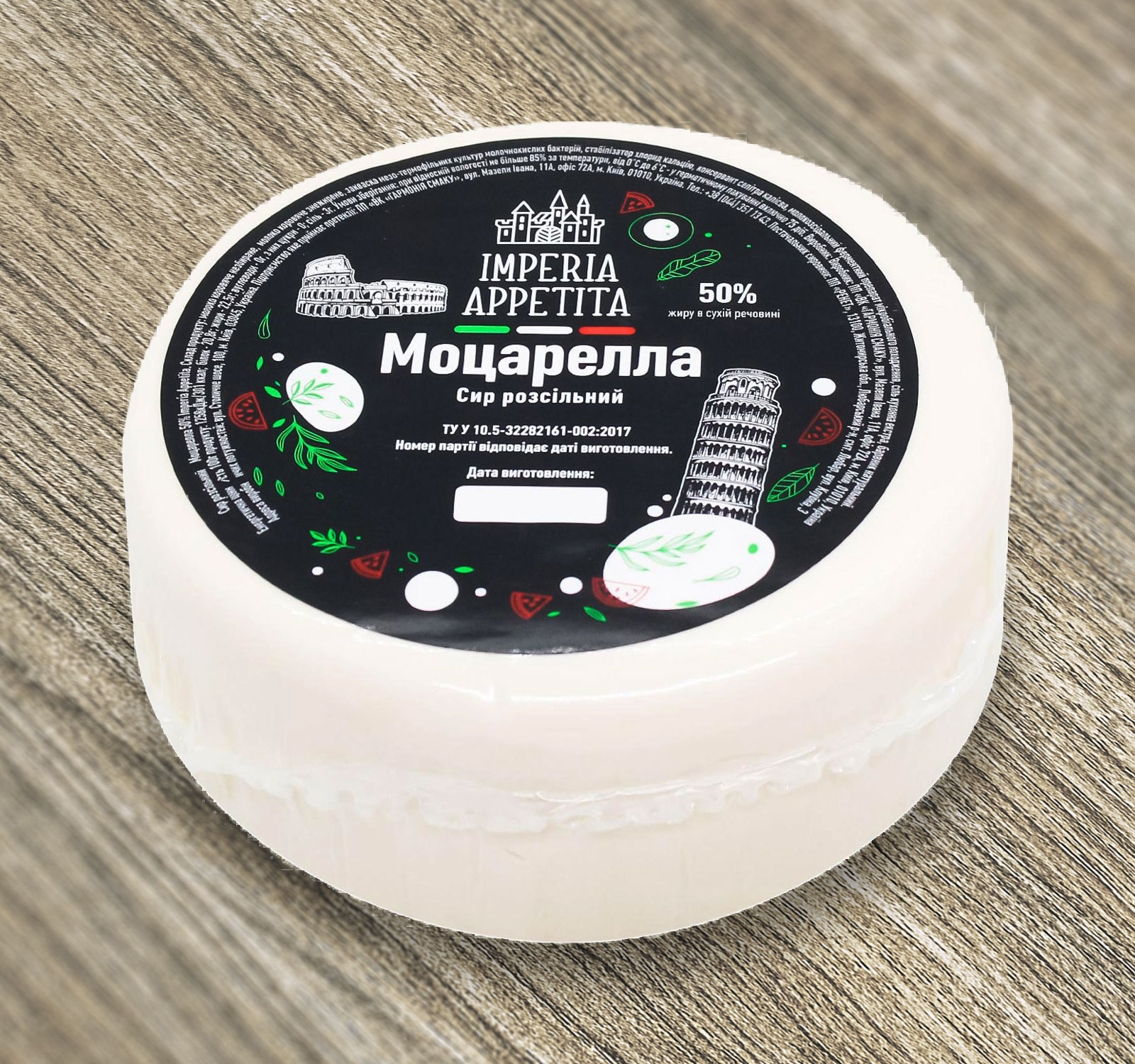 В нижній частині упаковки розміщене апетитне фото продукції, що передає свіжість, ніжну текстуру та натуральність сиру — головні характеристики справжньої моцарели.