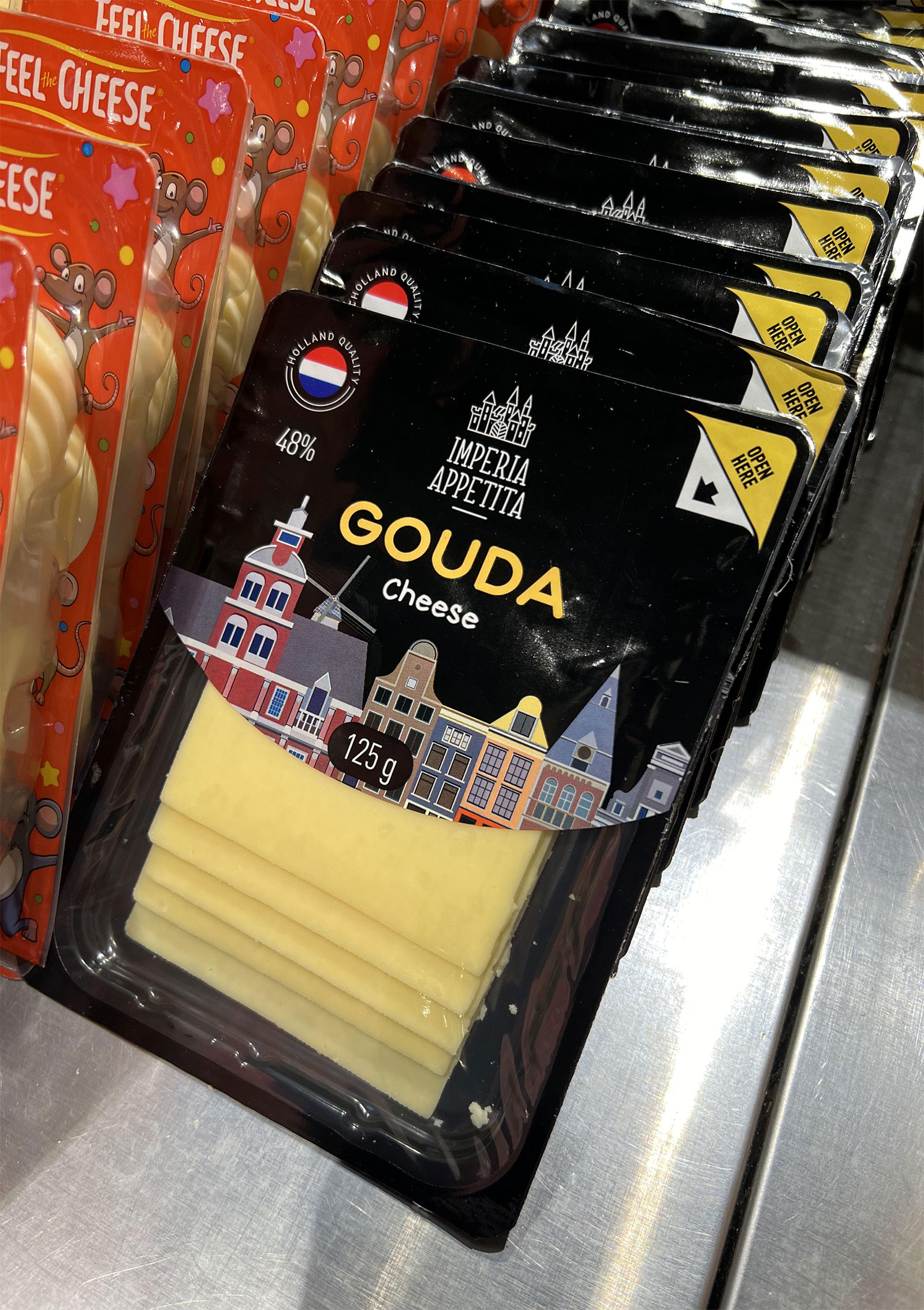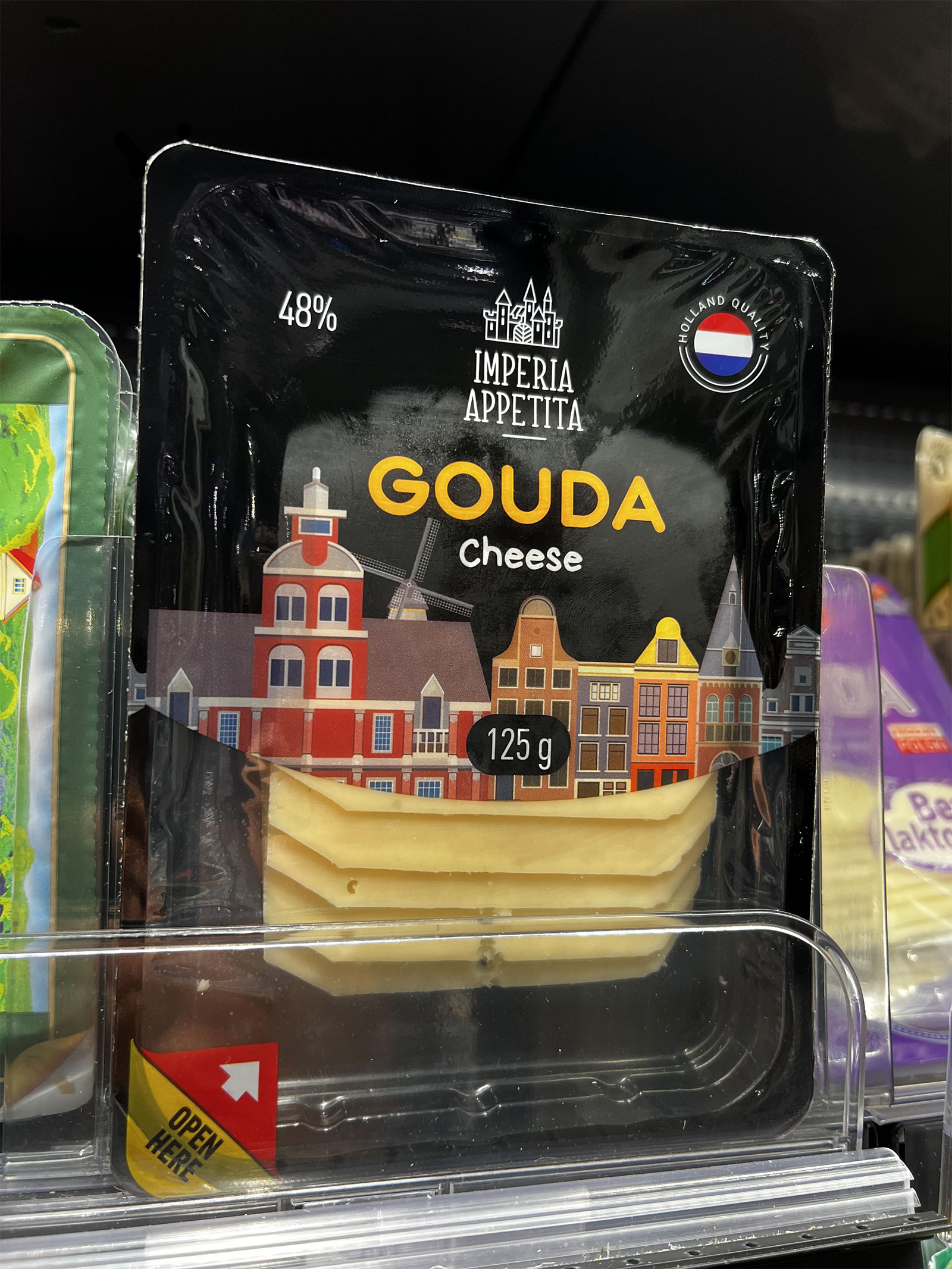 Ці ілюстрації не лише прикрашають етикетку, а й розповідають візуальну історію походження сиру, створюючи атмосферу подорожі Європою через смак. Такий підхід до дизайну дозволяє легко відрізнити кожен вид сиру на полиці, надає упаковці впізнаваності та формує емоційний зв’язок з продуктом.