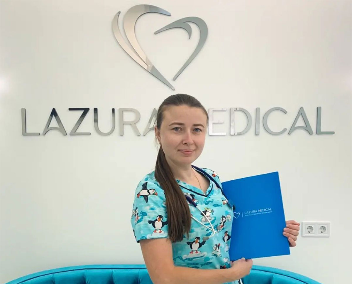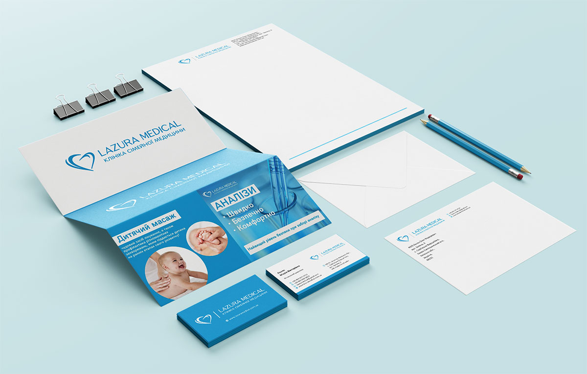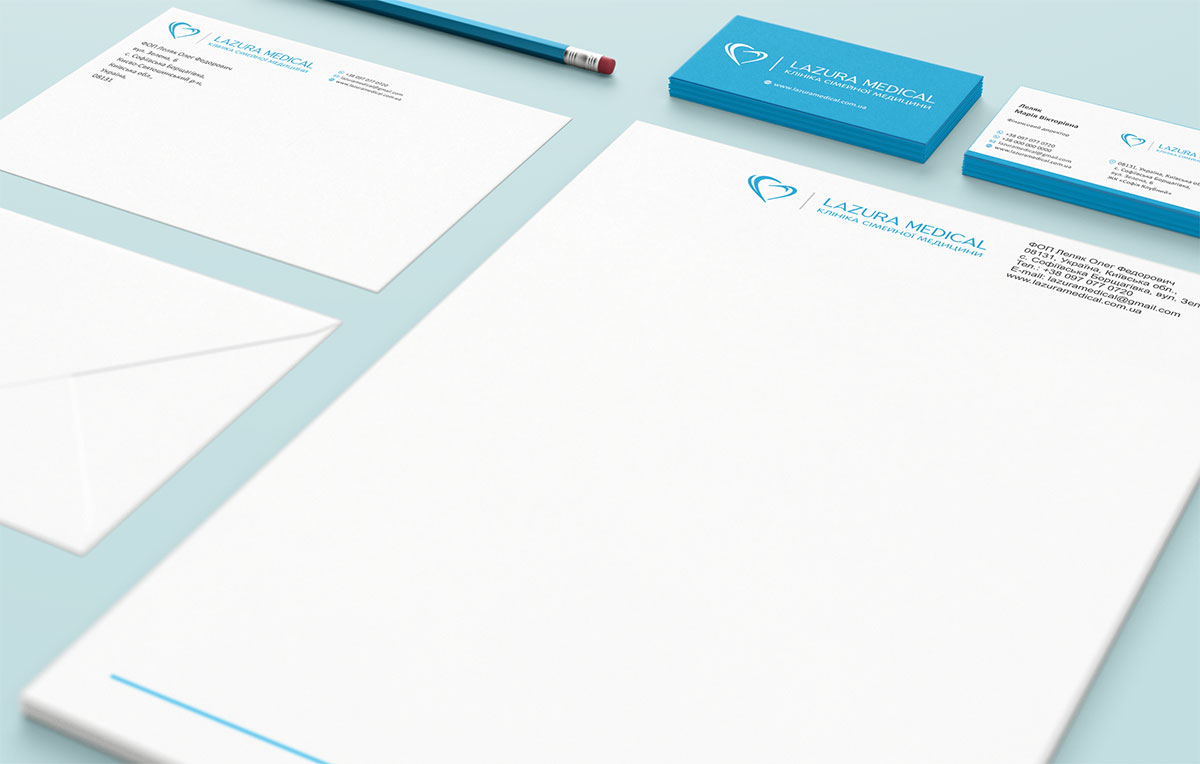 Шрифтове написання назви “LAZURA” розроблено дизайнерами нашої студії та виконане у строгому стилі. Для розшифровки діяльності було прийнято використати у логотипі дескриптор “клініка сімейної медицини”.