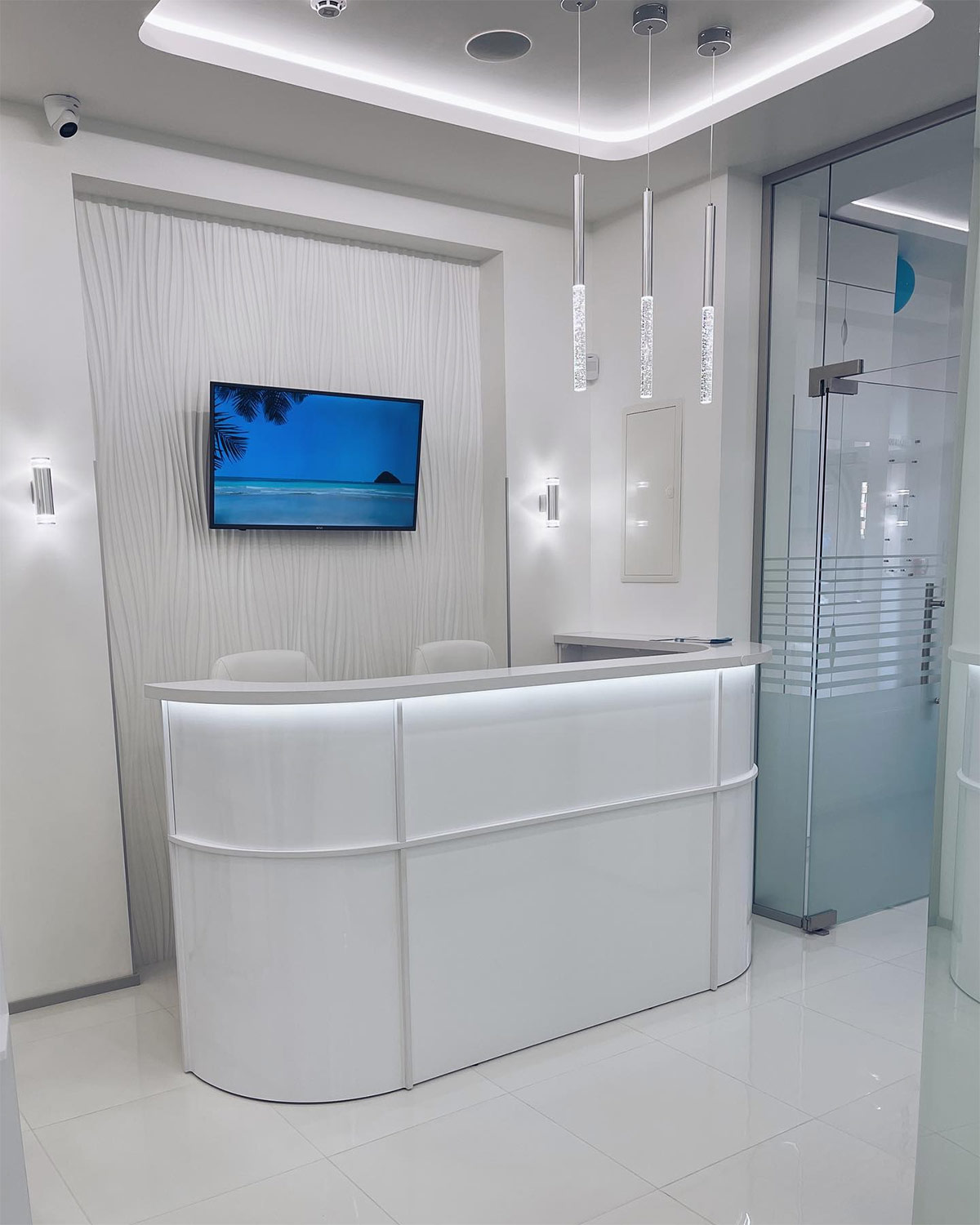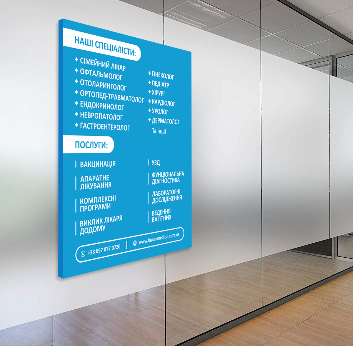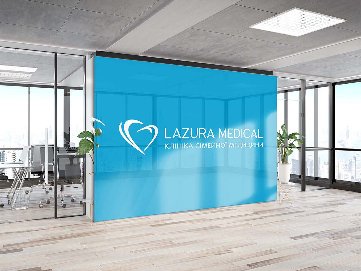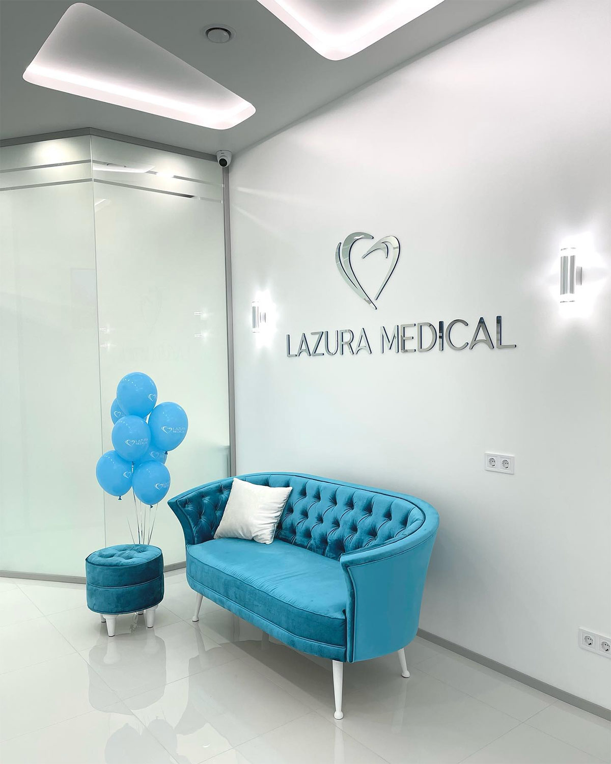 LAZURA - слово, з яким асоціюється гарний настрій, затишок та комфорт у клініці, що дуже важливо для пацієнта, який відвідуватиме медичний центр. При оформленні інтер'єру стіни можна оформити у вигляді безхмарного неба.