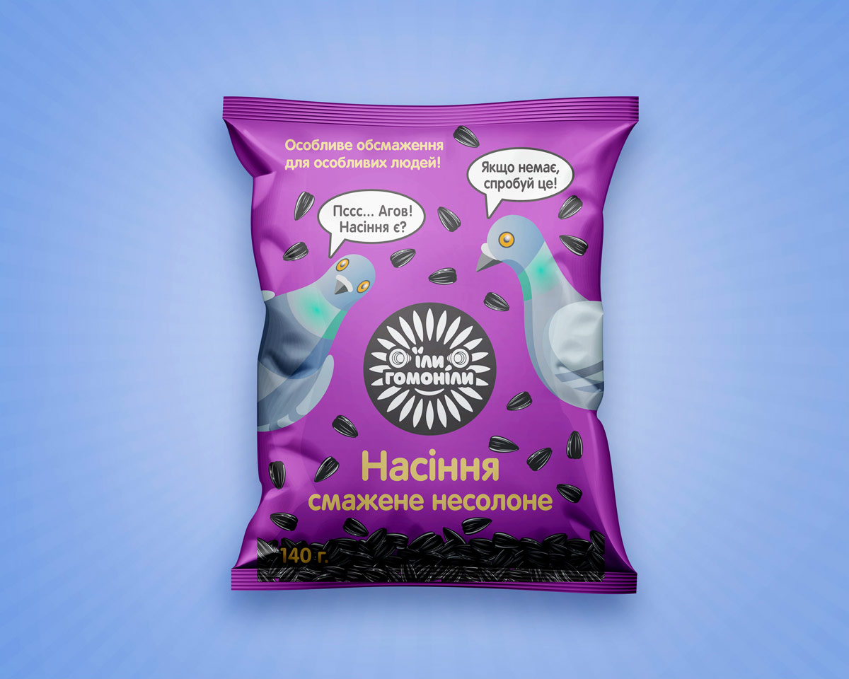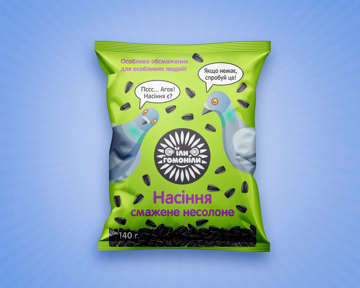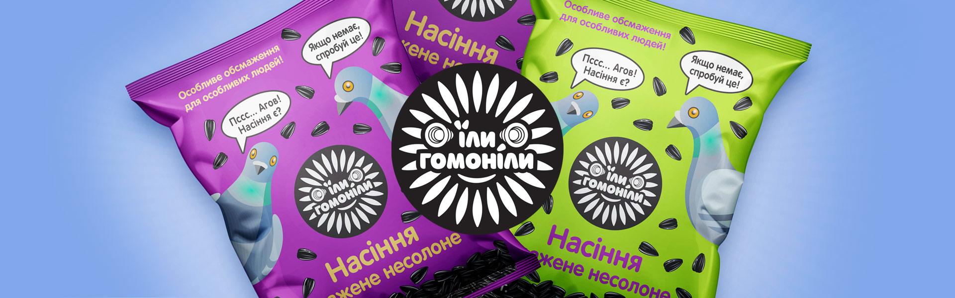 На основі створеного логотипу було розроблено дизайн упаковки для насіння. Було поставлене завдання створити дизайн упаковки насіння, що виділяється серед конкурентів - веселий і оригінальний. Спираючись на переваги цільової аудиторії з розвиненим смаком, що віддає перевагу вишуканості та новизні, ми вивчили загальні тенденції позиціонування у конкурентів. На основі загального аналізу візуальних образів та торгових пропозицій було сформовано загальне розуміння графічної взаємодії зі споживачем – голуби (які безпосередньо асоціюються з тематикою насіння), які спілкуються між собою та залучають Вас до діалогу.