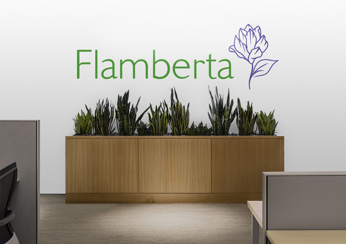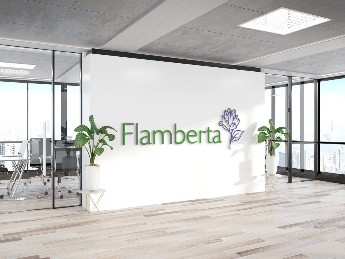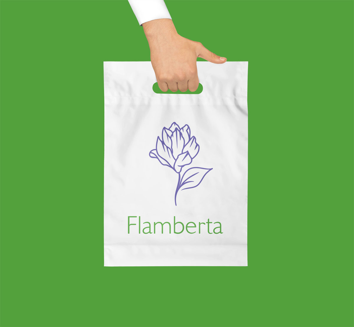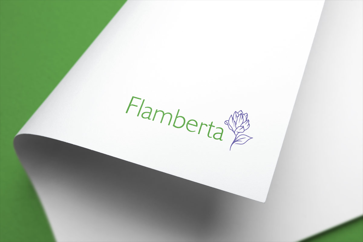 До розробки логотипу бренду Замовником були висунуті наступні вимоги - простотий у використанні і образ, що відображає тематику бренду. Після детального обговорення різних варіантів Замовник затвердив наведений нижче варіант логотипу, який виконаний у вигляді назви та квітки. Шрифтове написання назви Flamberta в логотипі розроблено дизайнерами нашої студії та адаптовано під загальний стиль.