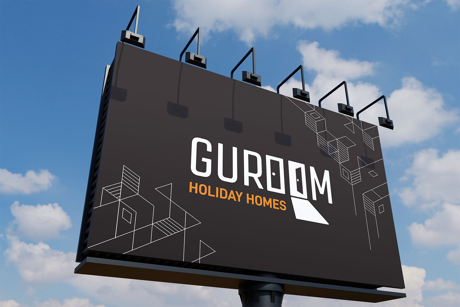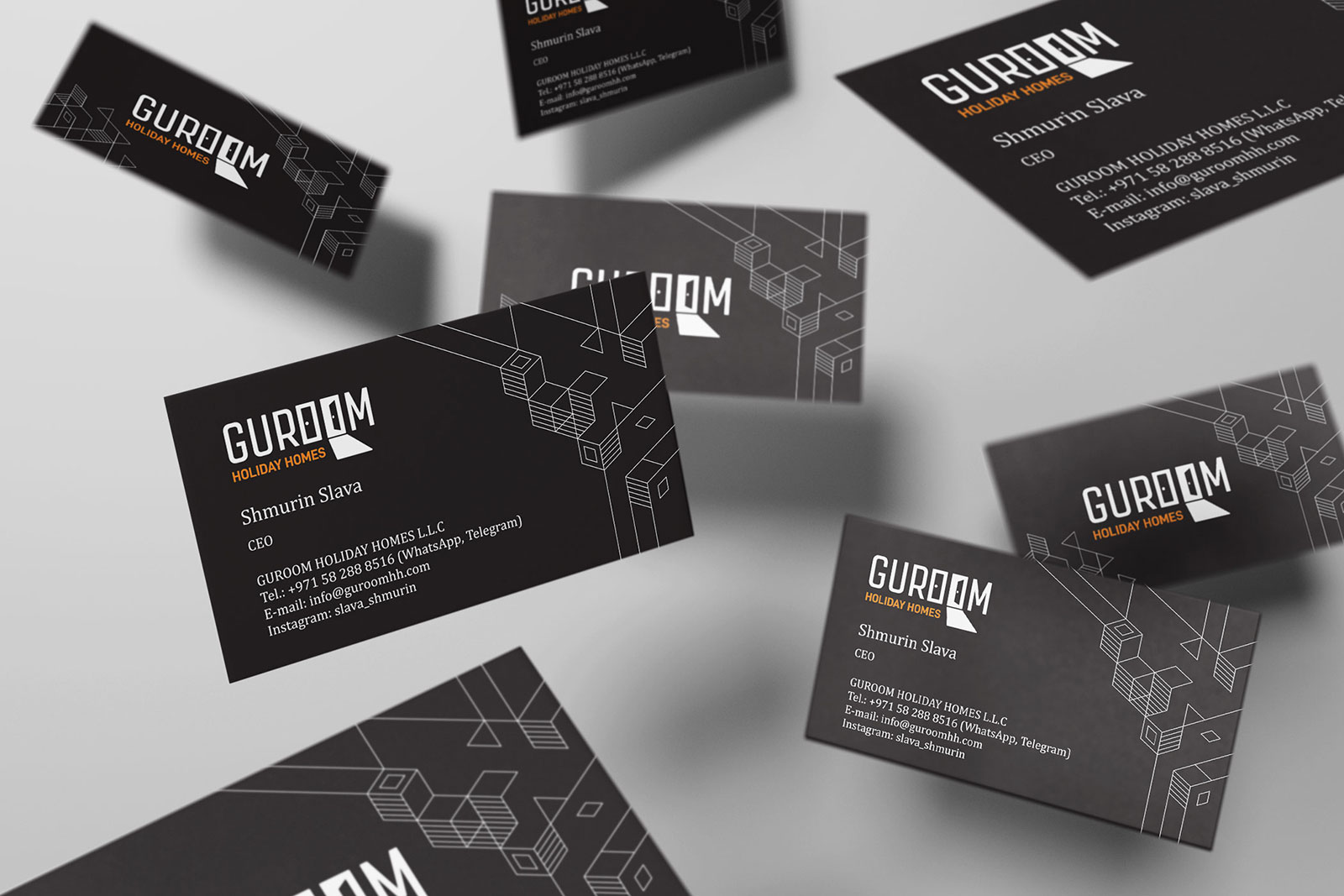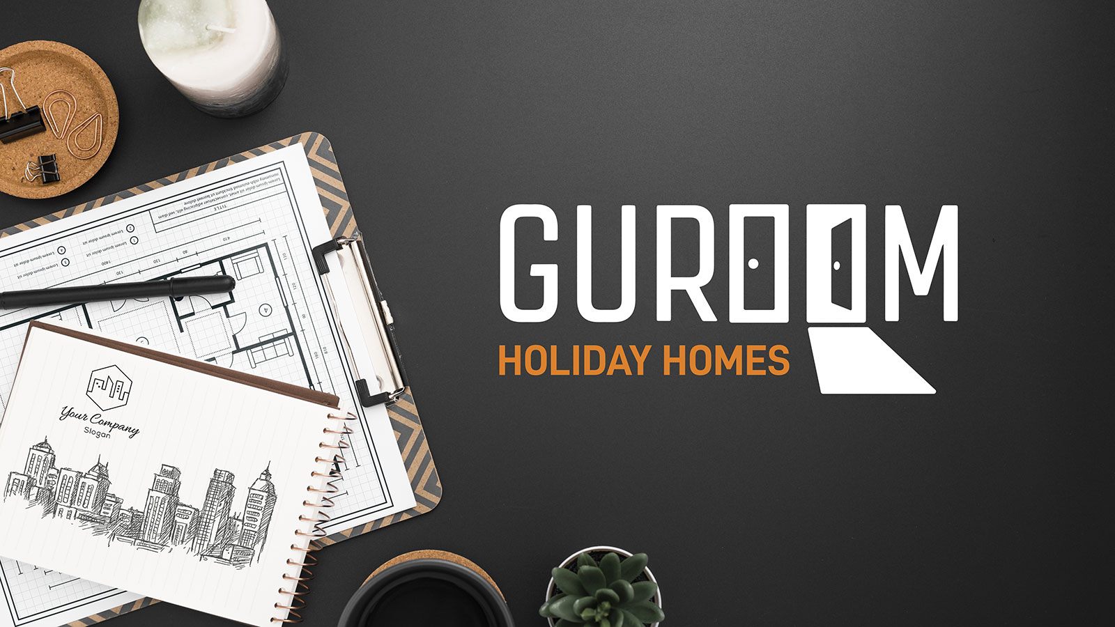 Шрифтове написання назви “GUROOM” розроблено дизайнерами нашої студії та виконане у строгому стилі. Для розшифровки діяльності було використано в логотипі дескриптор “Holiday Homes”.