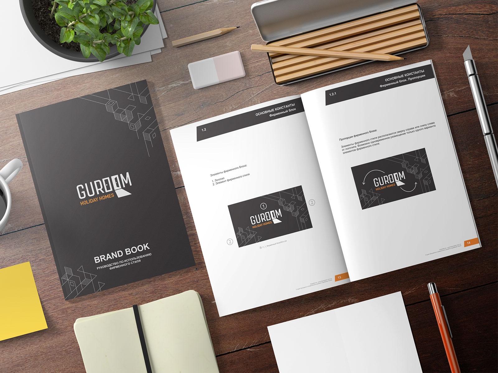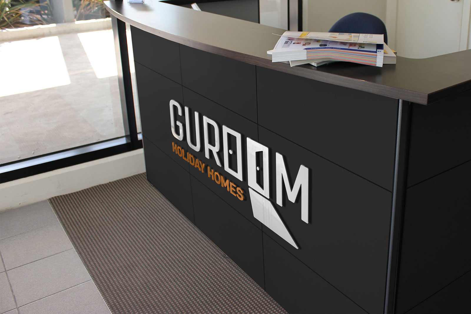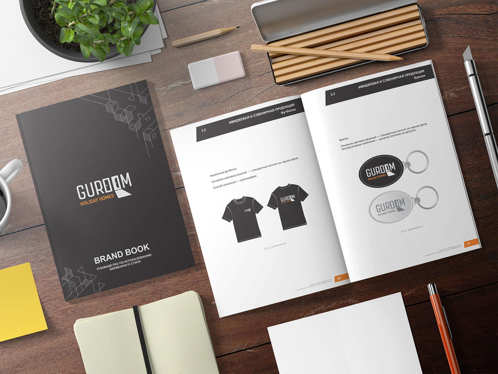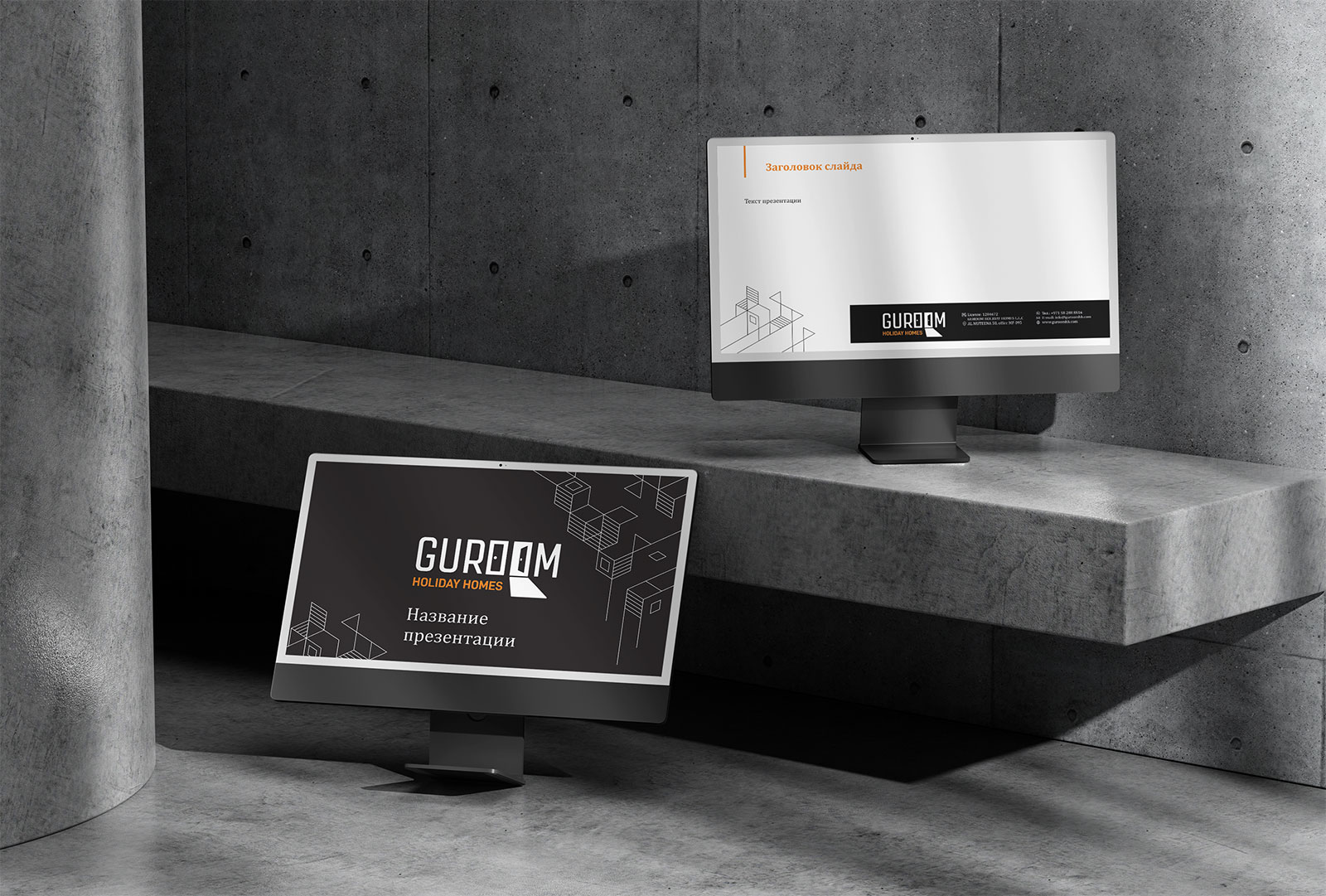 Шрифтове написання назви “GUROOM” розроблено дизайнерами нашої студії та виконане у строгому стилі. Для розшифровки діяльності було використано в логотипі дескриптор “Holiday Homes”.