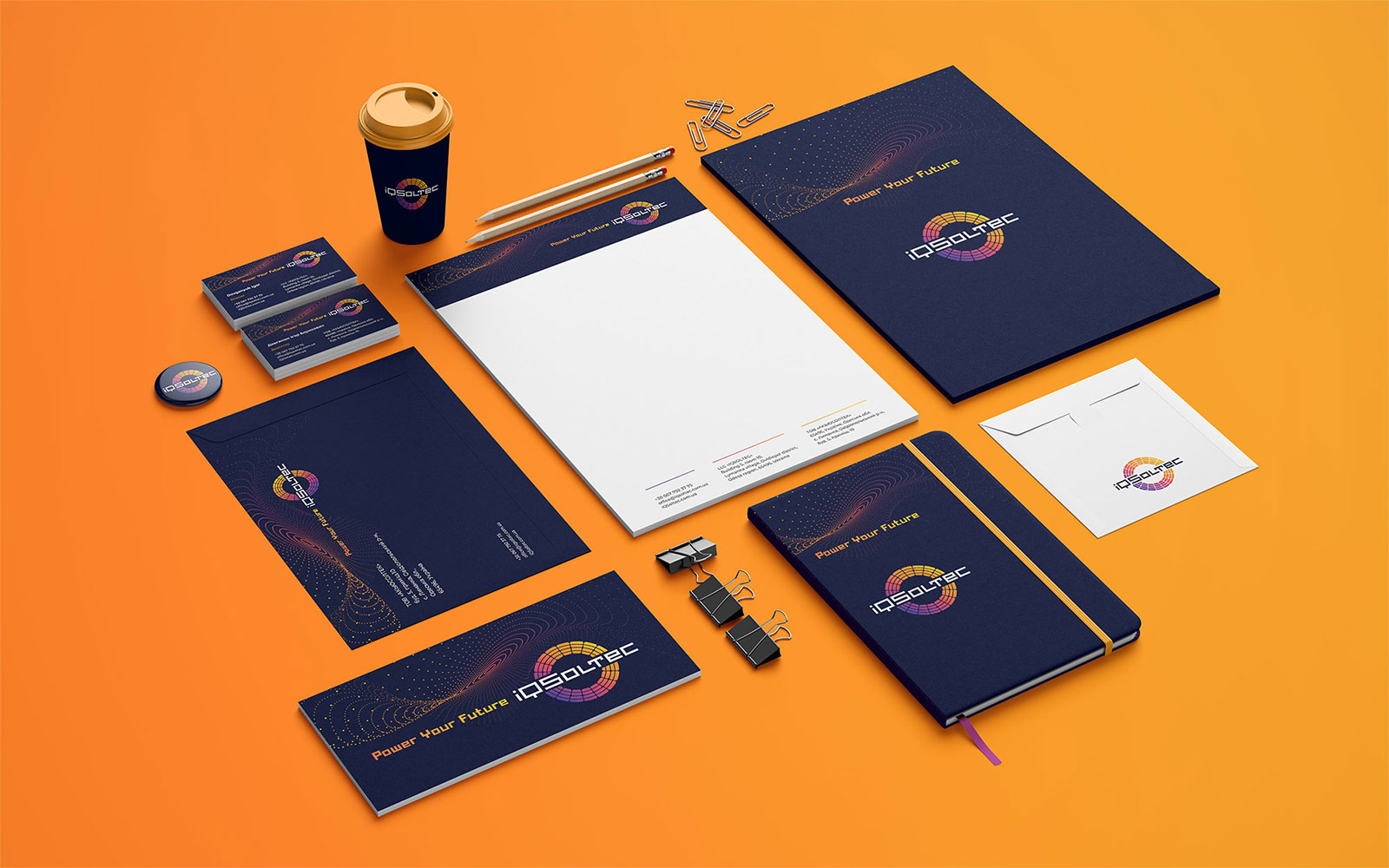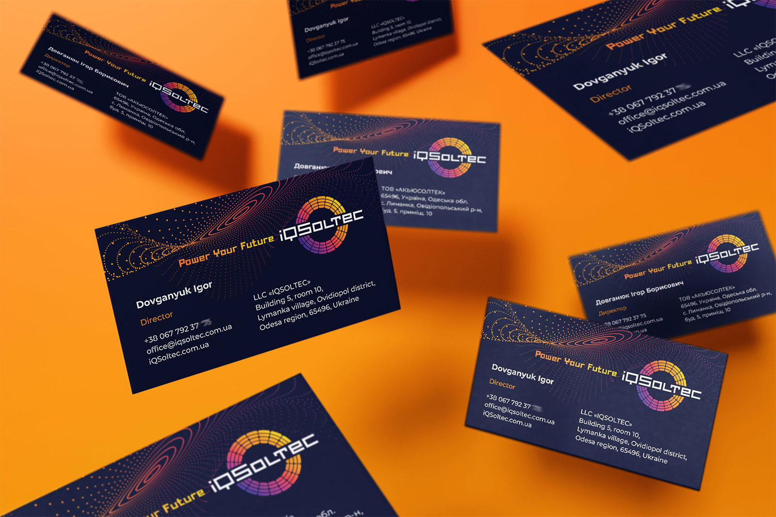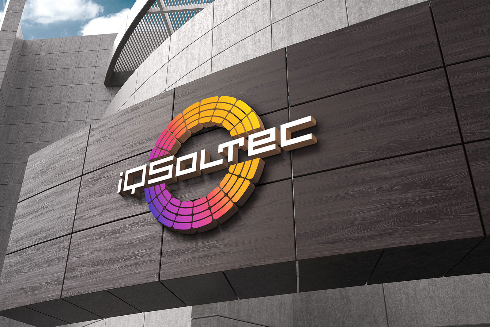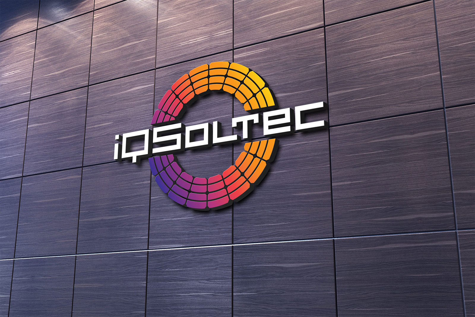 Після детального обговорення різних варіантів Замовник затвердив наведений нижче логотип, що складається зі знака у вигляді кола (відбиває сонце) з елементів сонячних панелей. Шрифтове написання назви "iQSoltec" розроблено дизайнерами нашої студії та виконане у строгому стилі.