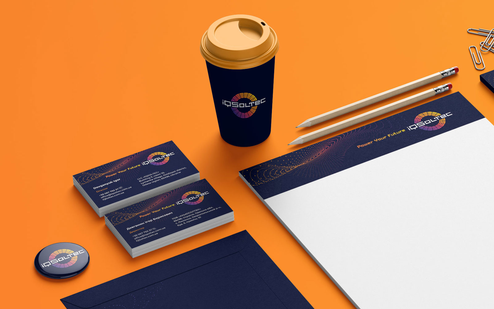 Особливу увагу хочеться приділити фірмовому стилю, який дизайнери студії пропрацювали досить ретельно. В рамках замовлення було розроблено стандартний набір документів: візитні картки, конверт, фірмовий бланк та інше. Розроблений фірмовий стиль своїми точками та лініями доповнює логотип, створюючи єдиний та універсальний блок інформації. Крапки і лінії побічно відбивають закон Гаусса — одне із основних законів електродинаміки: кількість ліній, які виходять із замкнутої поверхні, пропорційно сумарному кількості зарядів всередині неї — тобто кількості ліній, що виникли всередині неї. Цей закон виражає зв'язок між потоком напруженості електричного поля крізь замкнуту поверхню довільної форми і сумою алгебри зарядів, розташованих всередині об'єму, обмеженого цією поверхнею. Застосовується обчислення електростатичних полів.