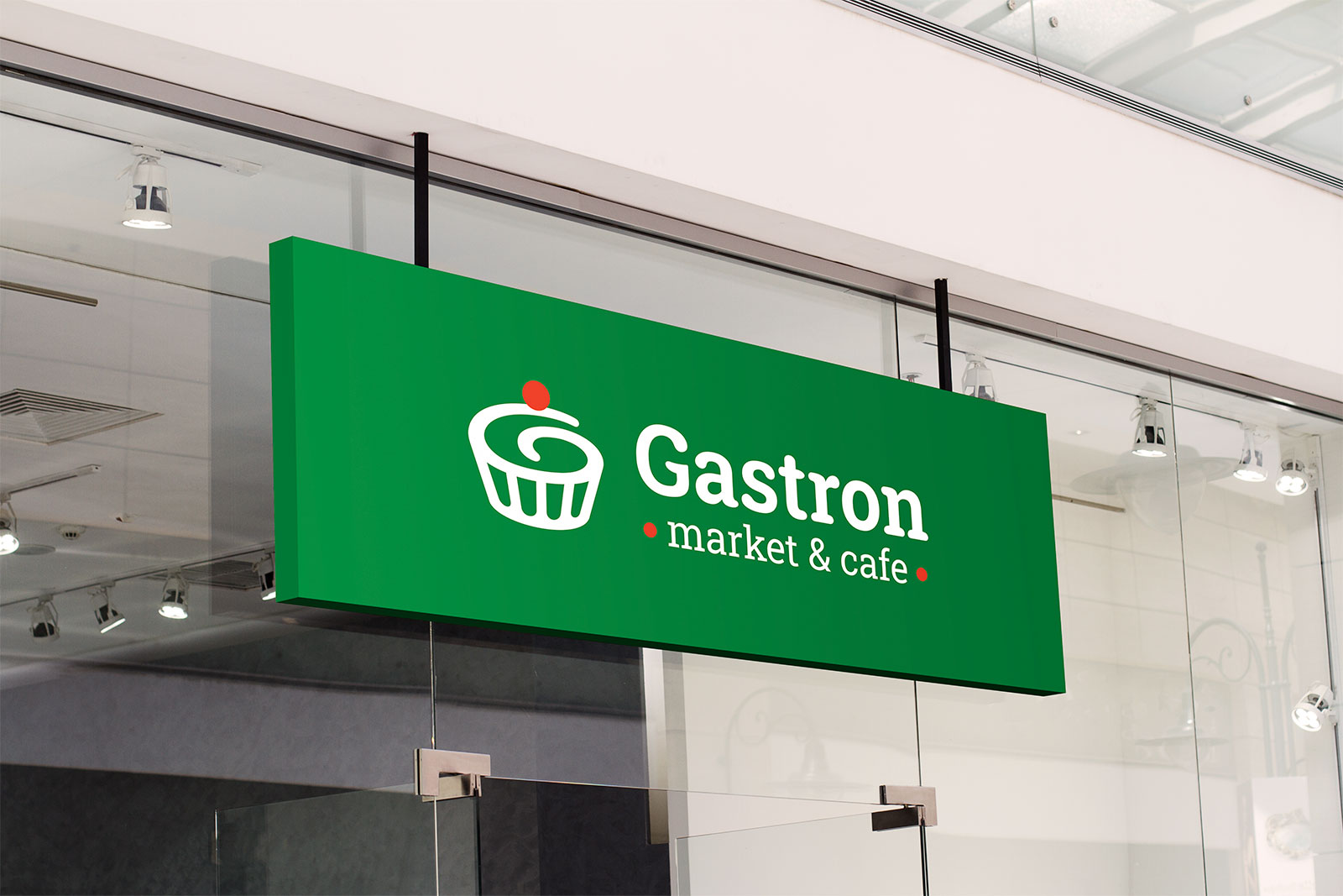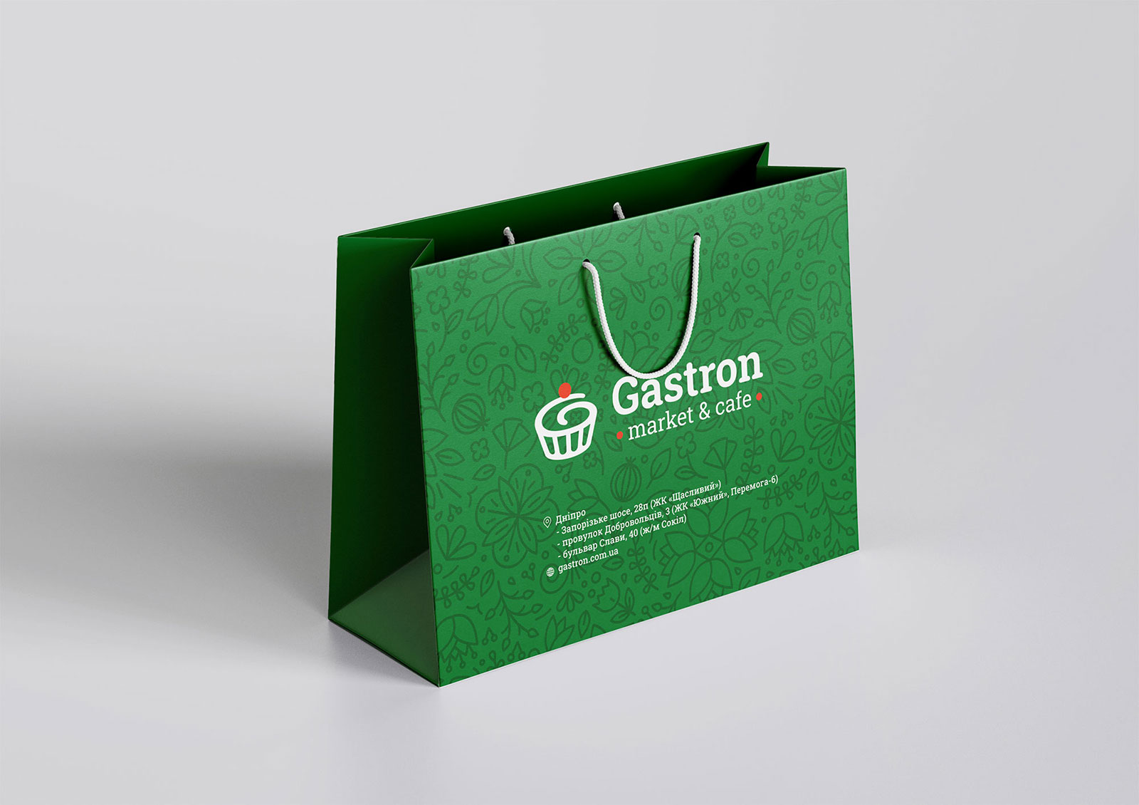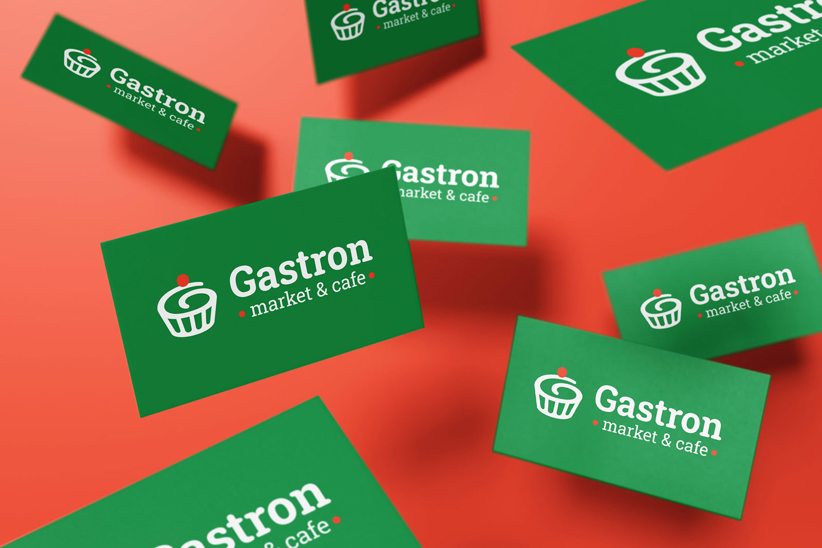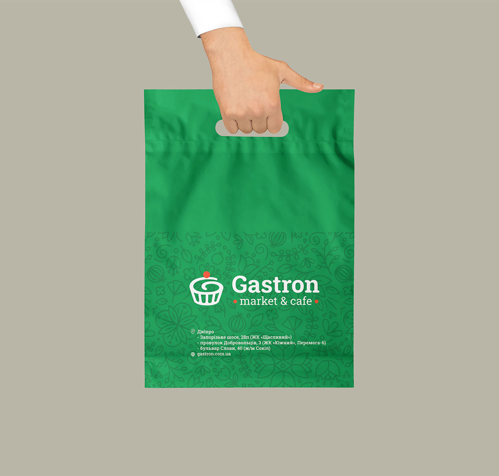 Шрифтове написання назви "Gastron" розроблено дизайнерами нашої студії та виконане у строгому стилі. Для розшифровки діяльності прийнято використовувати в логотипі дескриптор “market”.