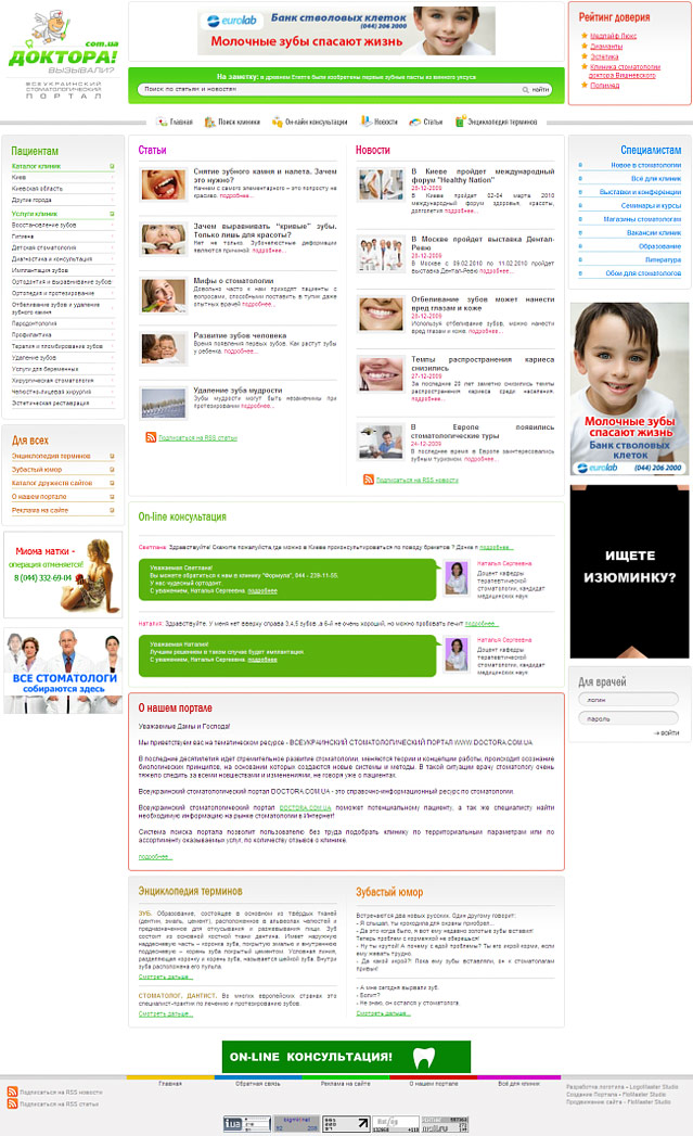 ДОКТОРА - повноцінний тематичний ресурс, який цікавий як фахівцям у галузі стоматології, так і людям, яким необхідна стоматологічна допомога або просто цікава дана тематика. Портал DOCTORA.COM.UA допомагає потенційному пацієнту, а також фахівцеві в цій галузі знайти необхідну інформацію про ринок стоматології в Україні.