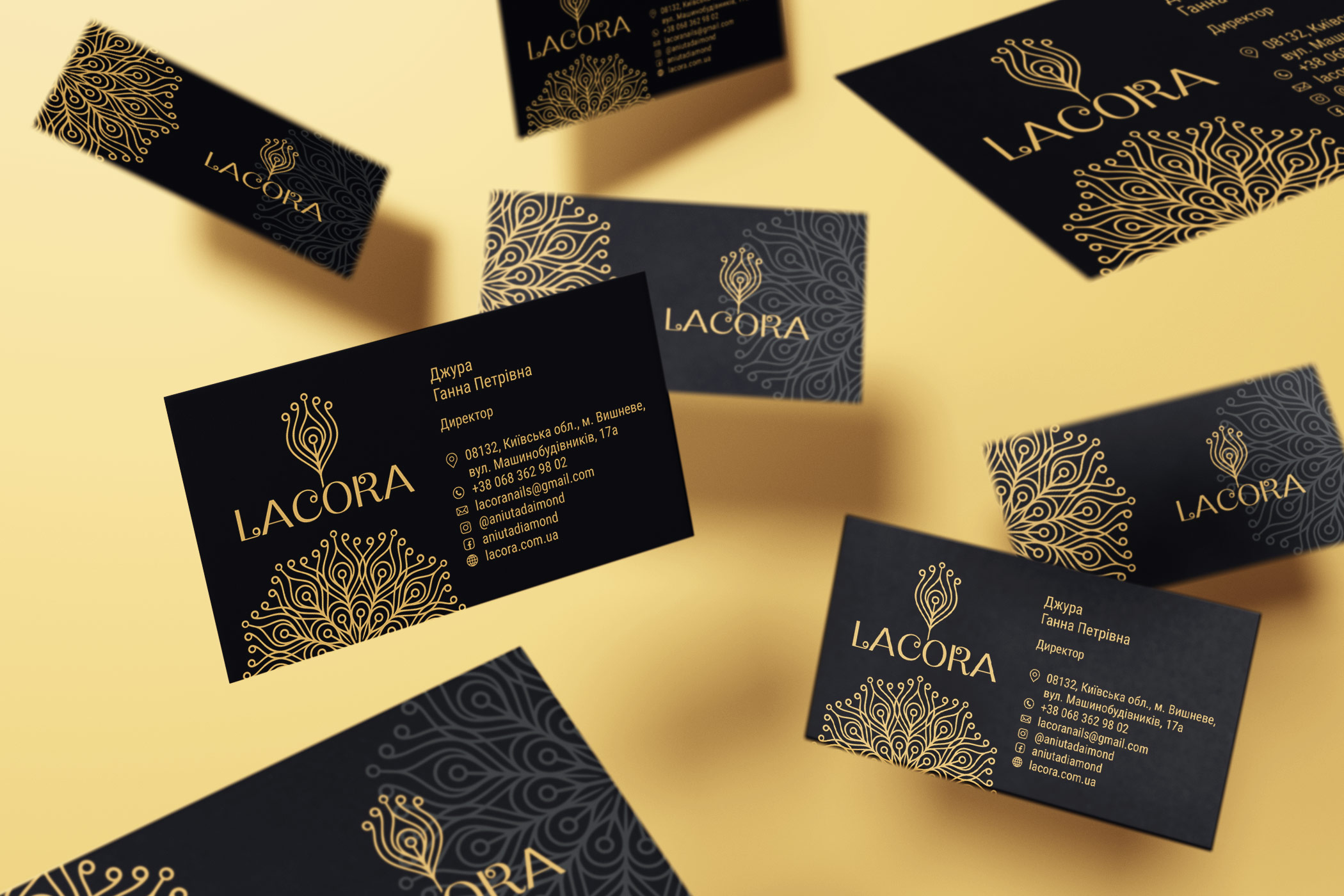 Шрифтове написання назви LACORA, розроблене дизайнерами студії, витримано у стриманому та елегантному стилі. Така графіка підкреслює солідність бренду, підсилюючи його візуальну ідентичність як надійного, естетично продуманого партнера у nail-індустрії.