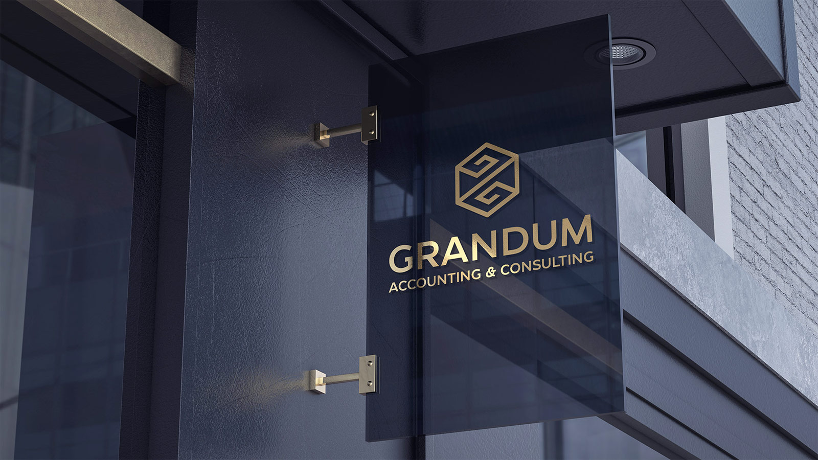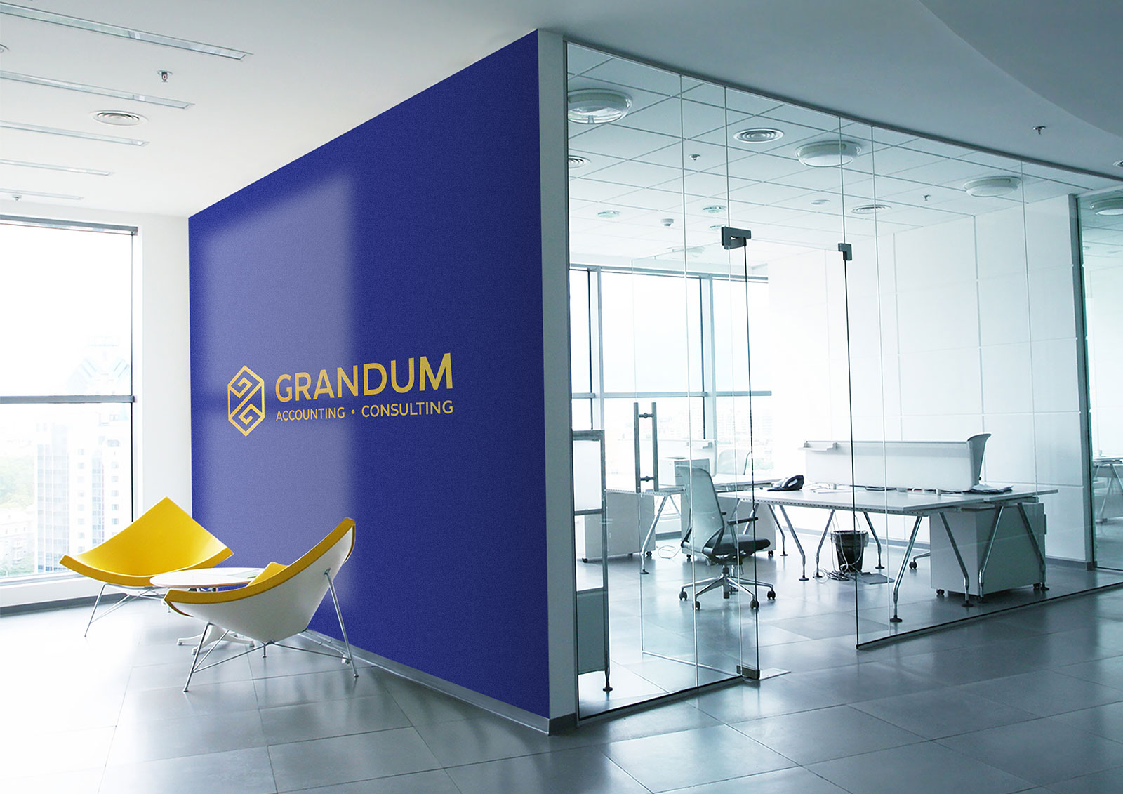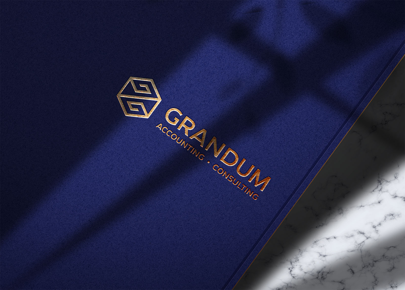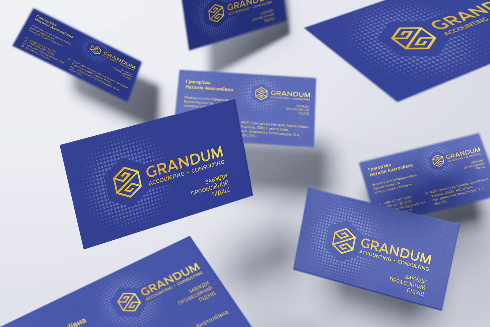 Шрифт написання назви компанії “GRANDUM” був спеціально опрацьований дизайнерами студії та виконано у строгому, геометрично вивіреному стилі, що підкреслює серйозність та статус бренду. Для більш чіткого позиціонування на ринку та розшифровки сфери діяльності, до логотипу також було додано дескриптор “ACCOUNTING ? CONSULTING”, який прямо вказує на ключовий напрямок діяльності компанії.