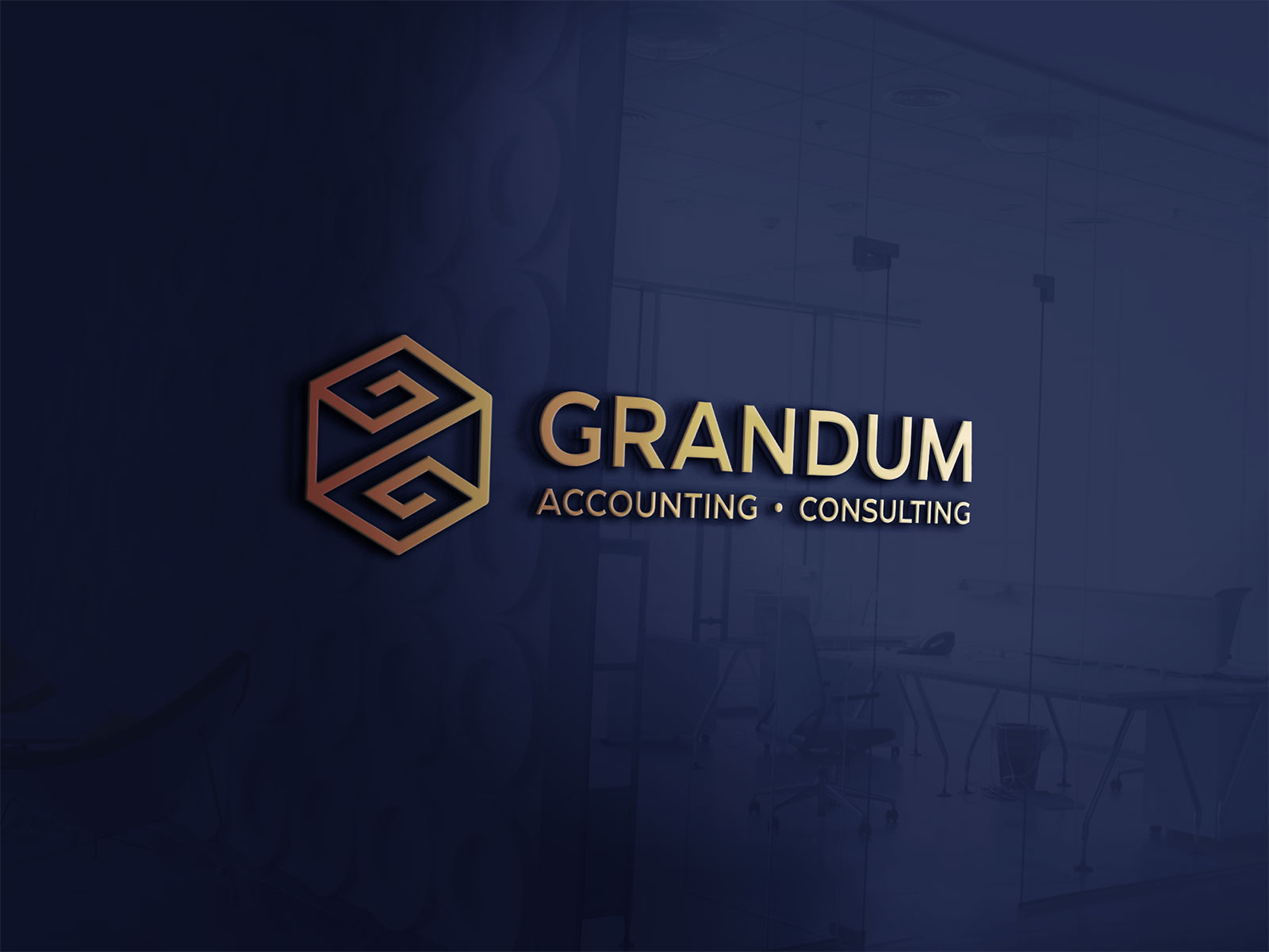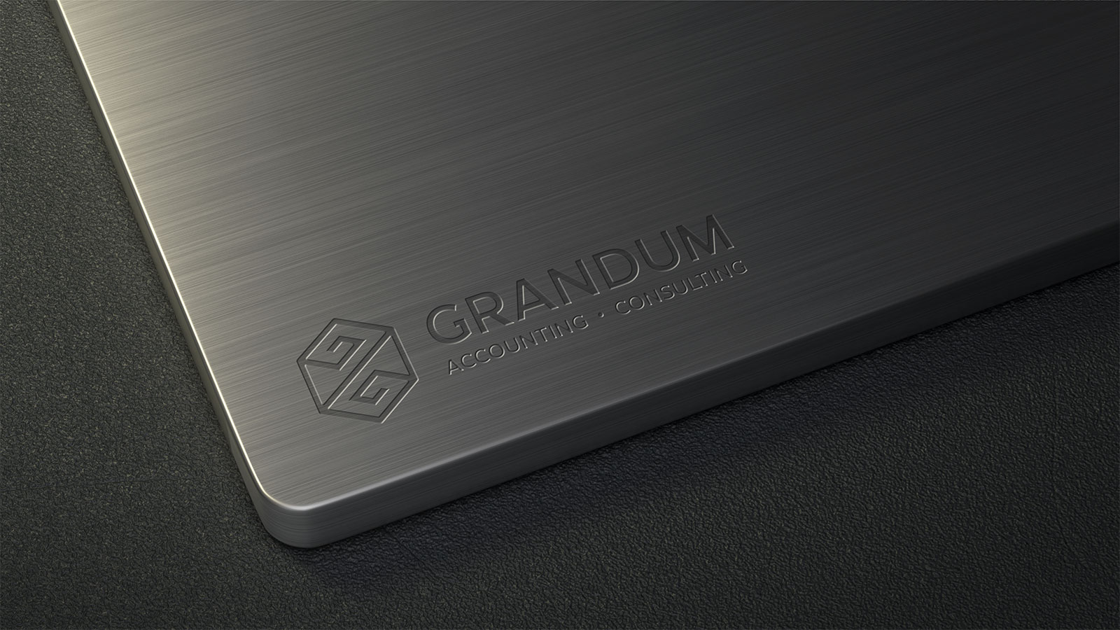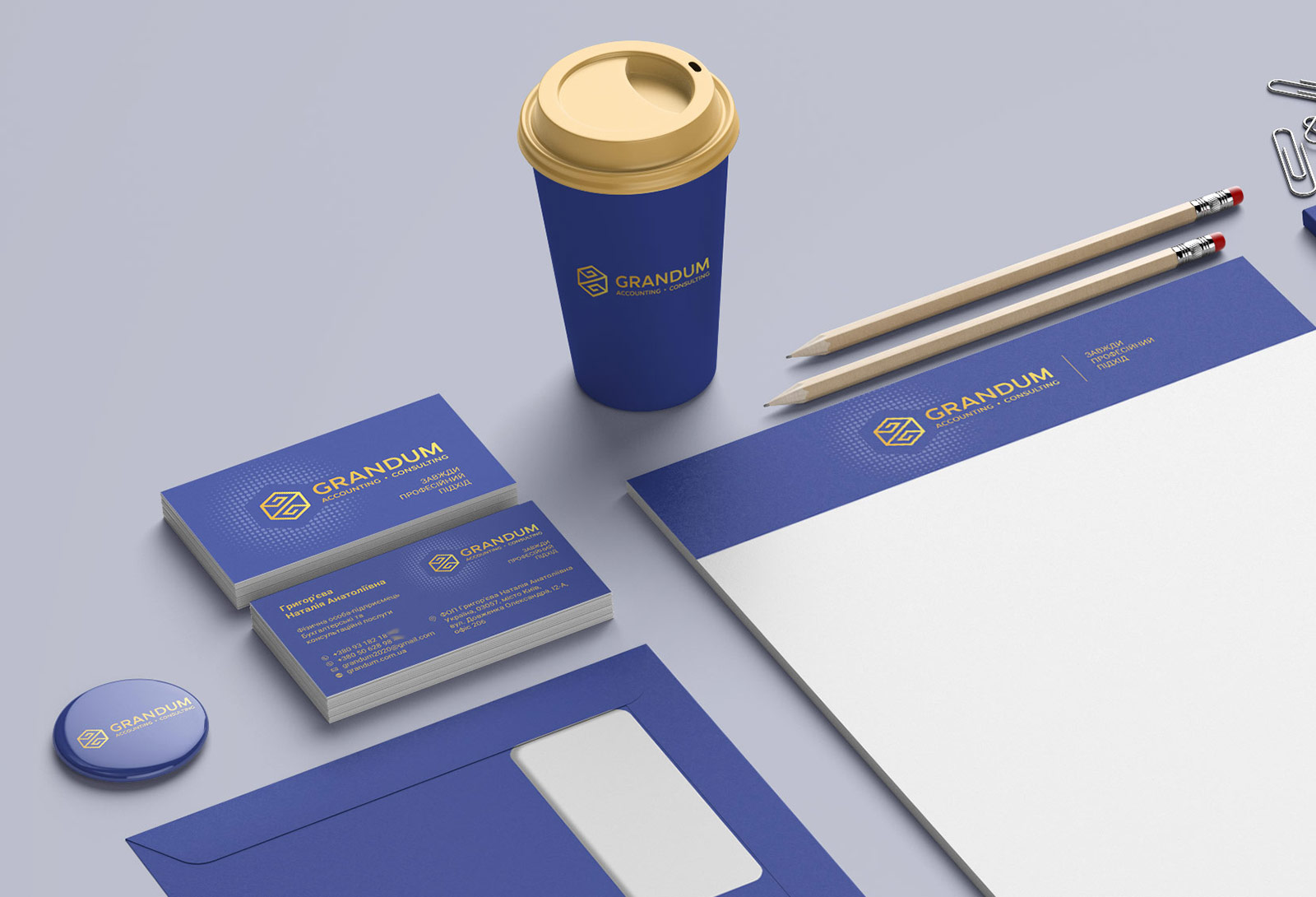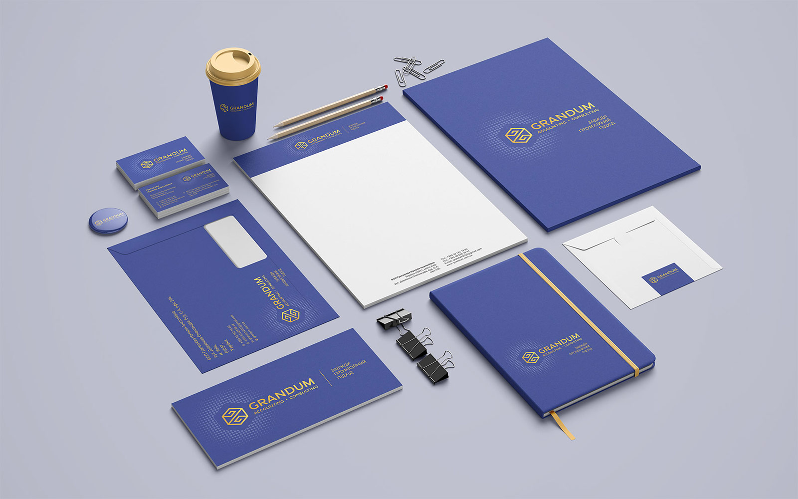 Шрифт написання назви компанії “GRANDUM” був спеціально опрацьований дизайнерами студії та виконано у строгому, геометрично вивіреному стилі, що підкреслює серйозність та статус бренду. Для більш чіткого позиціонування на ринку та розшифровки сфери діяльності, до логотипу також було додано дескриптор “ACCOUNTING ? CONSULTING”, який прямо вказує на ключовий напрямок діяльності компанії.