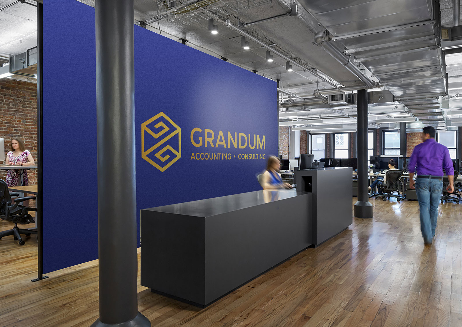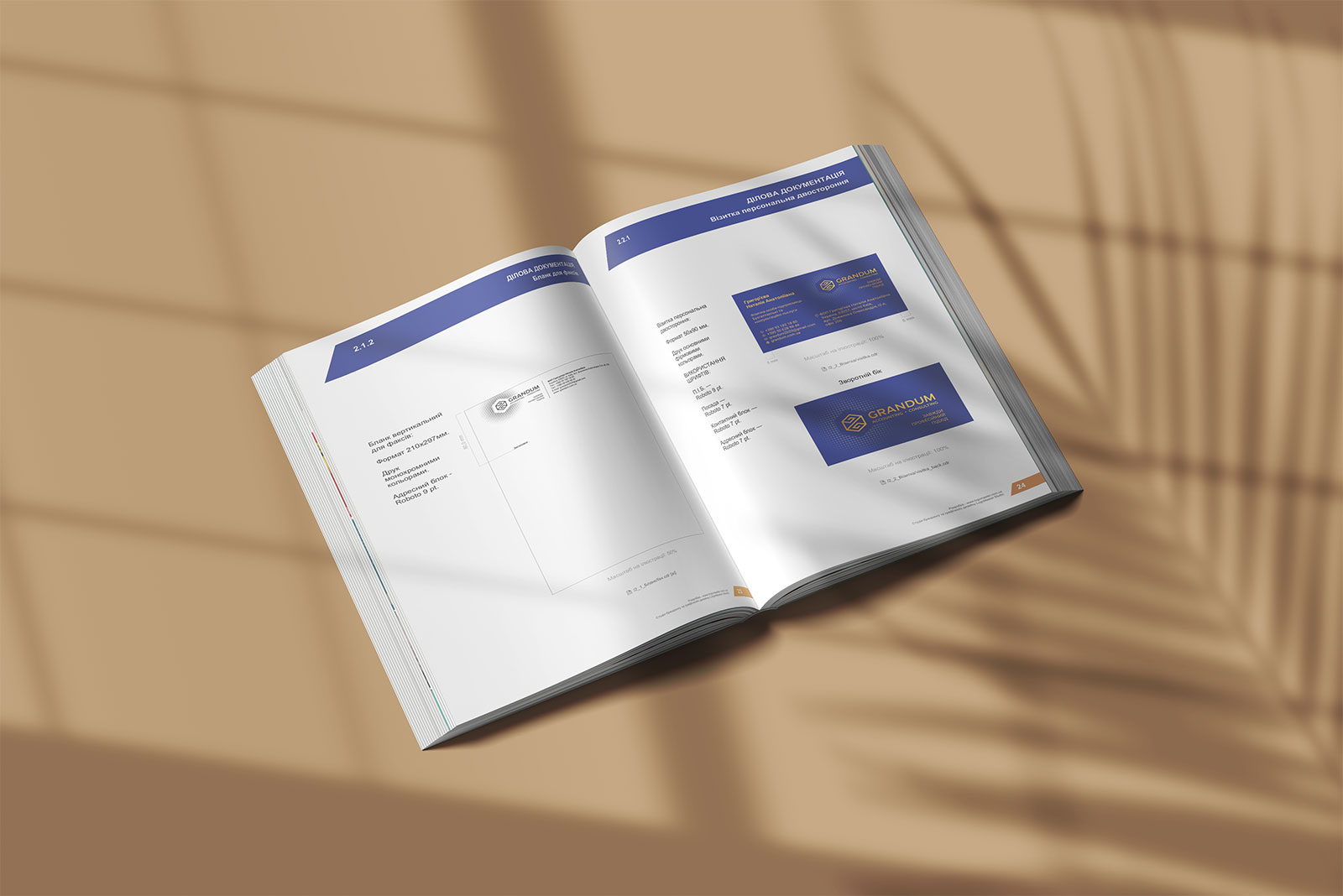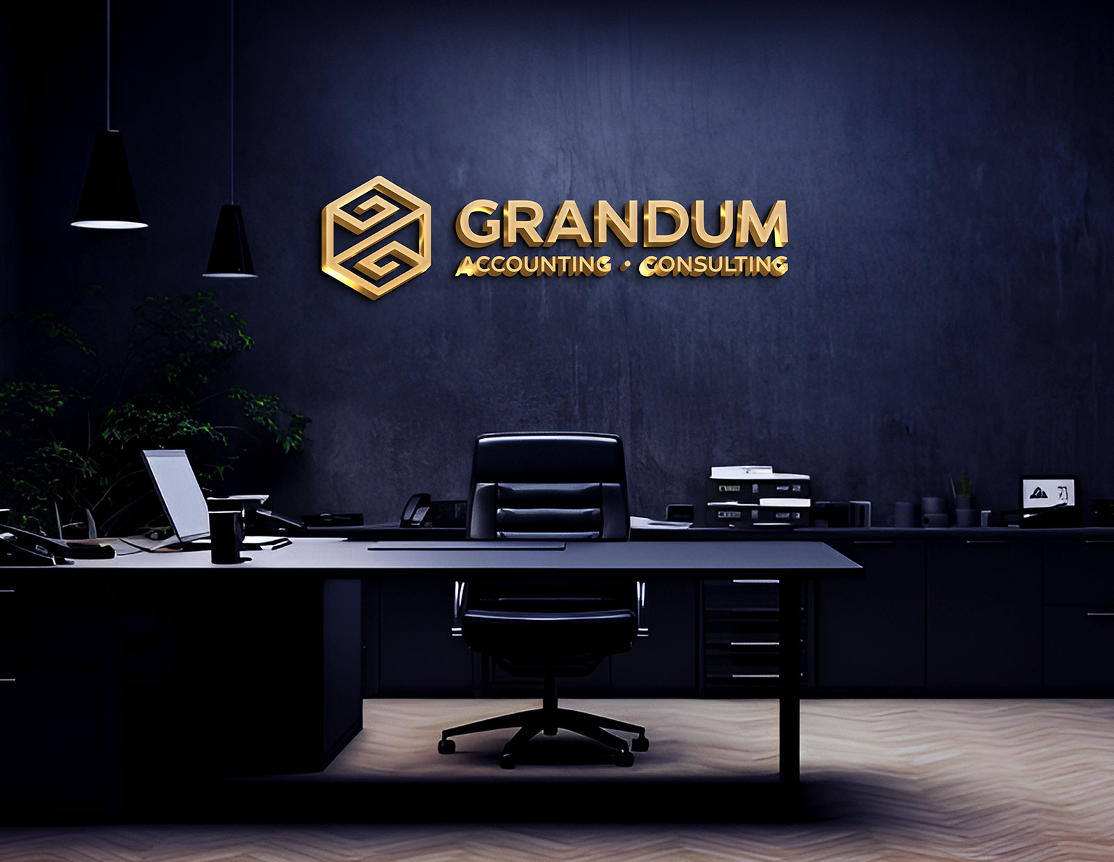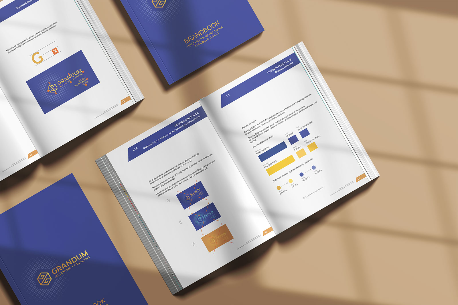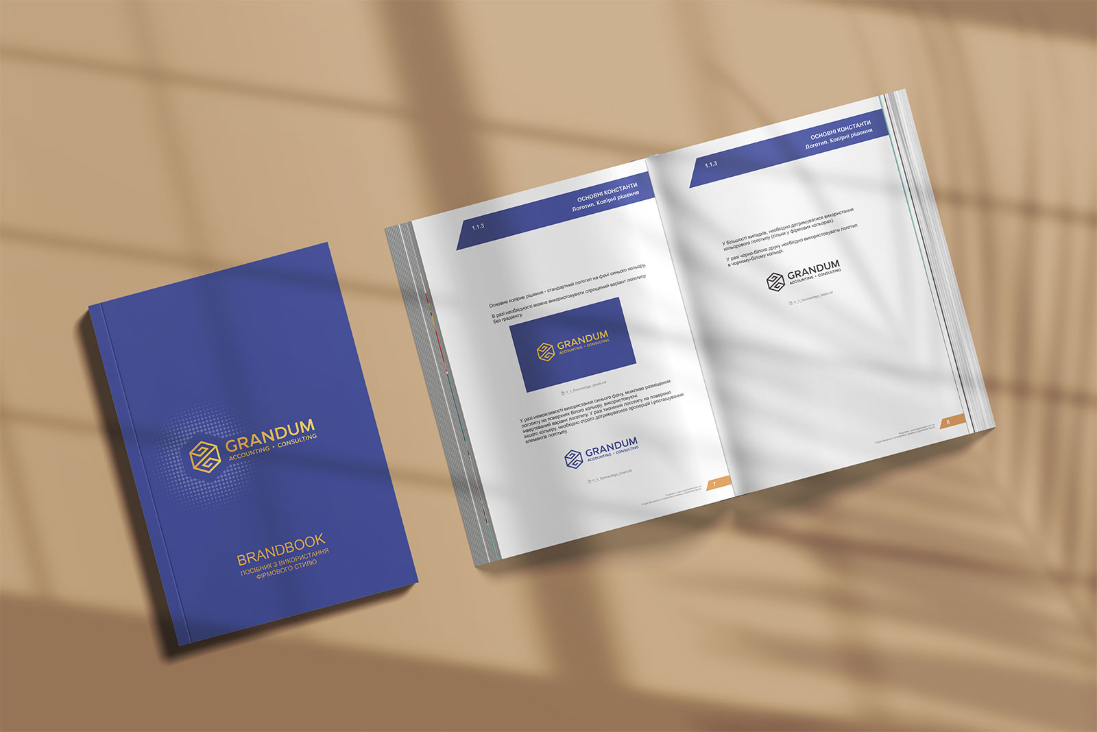 Шрифт написання назви компанії “GRANDUM” був спеціально опрацьований дизайнерами студії та виконано у строгому, геометрично вивіреному стилі, що підкреслює серйозність та статус бренду. Для більш чіткого позиціонування на ринку та розшифровки сфери діяльності, до логотипу також було додано дескриптор “ACCOUNTING ? CONSULTING”, який прямо вказує на ключовий напрямок діяльності компанії.