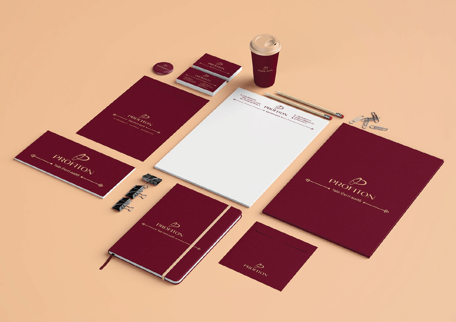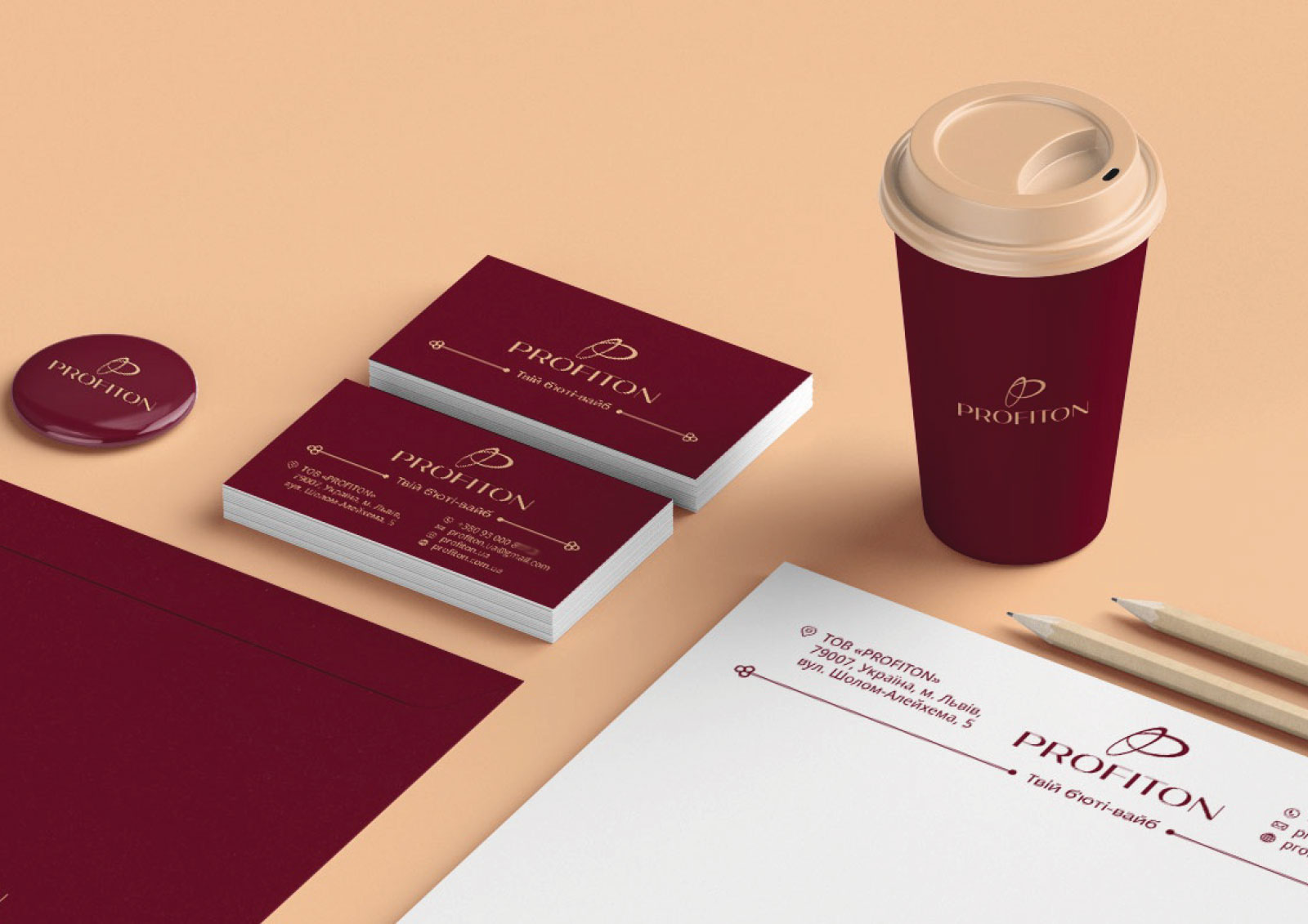 Таке рішення робить фірмовий стиль впізнаваним, естетичним та функціональним, підкреслює індивідуальність бренду та формує цілісний візуальний образ, що відповідає духу сучасного beauty-простору PROFITON.