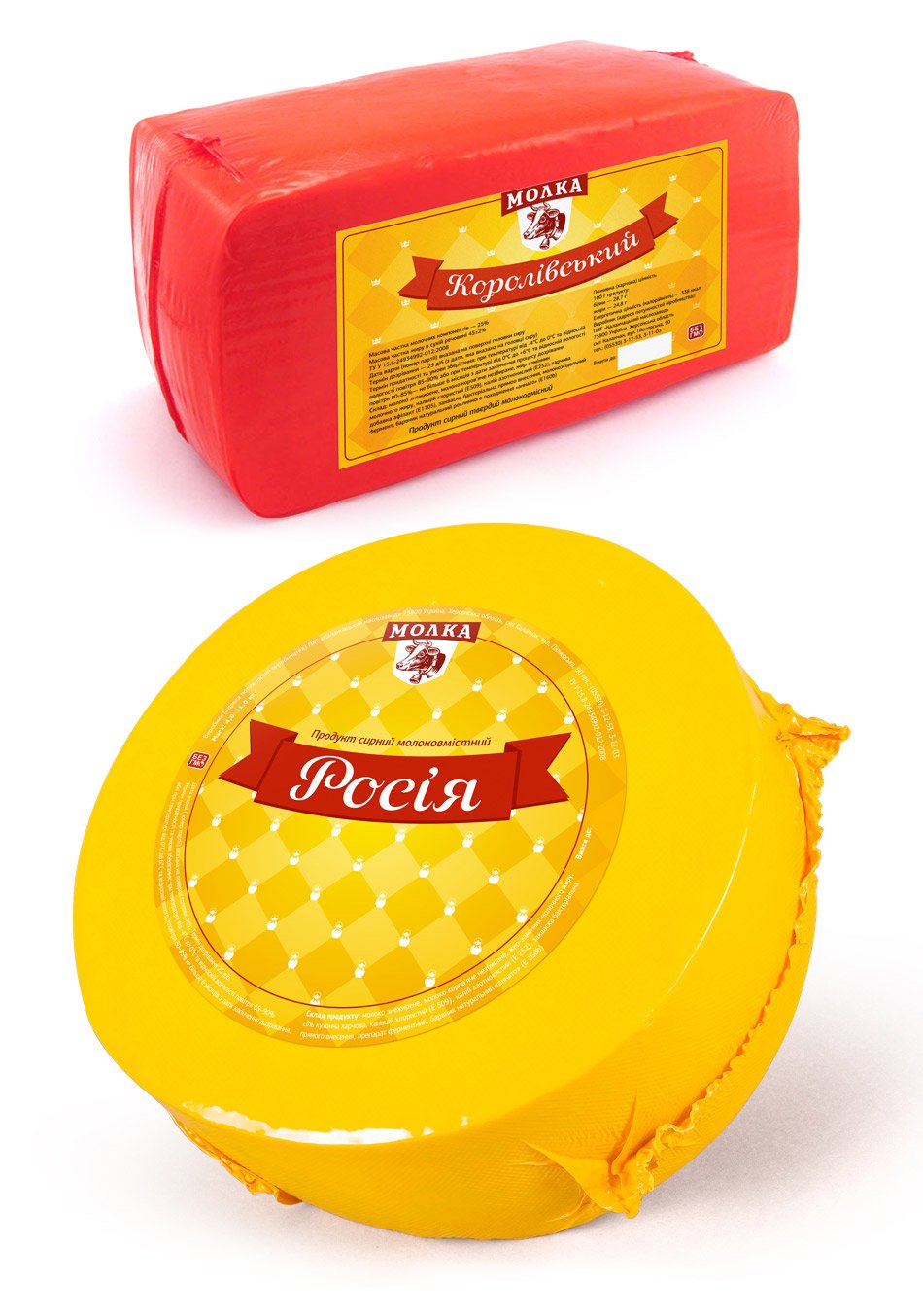 На підставі логотипу було розроблено етикетки для сирів: Російський, Голландський та Королівський.